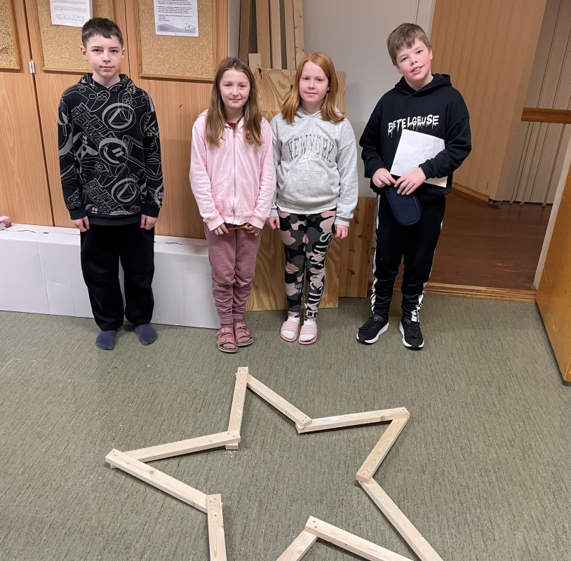 De ferdige stjernene ble hentet av mammaen og pappaen til Ulrik og Henrik. De festet lyslenkene på, og plasserte stjernene på veggen sist søndag. Dette til stor glede for oss alle på skolen. Med andre ord et nydelig samarbeid mellom skole og hjem.