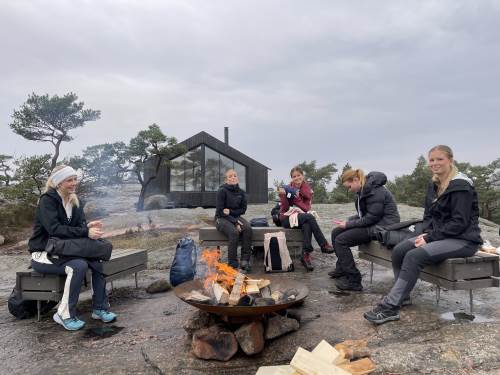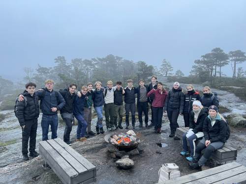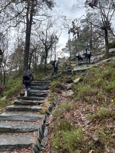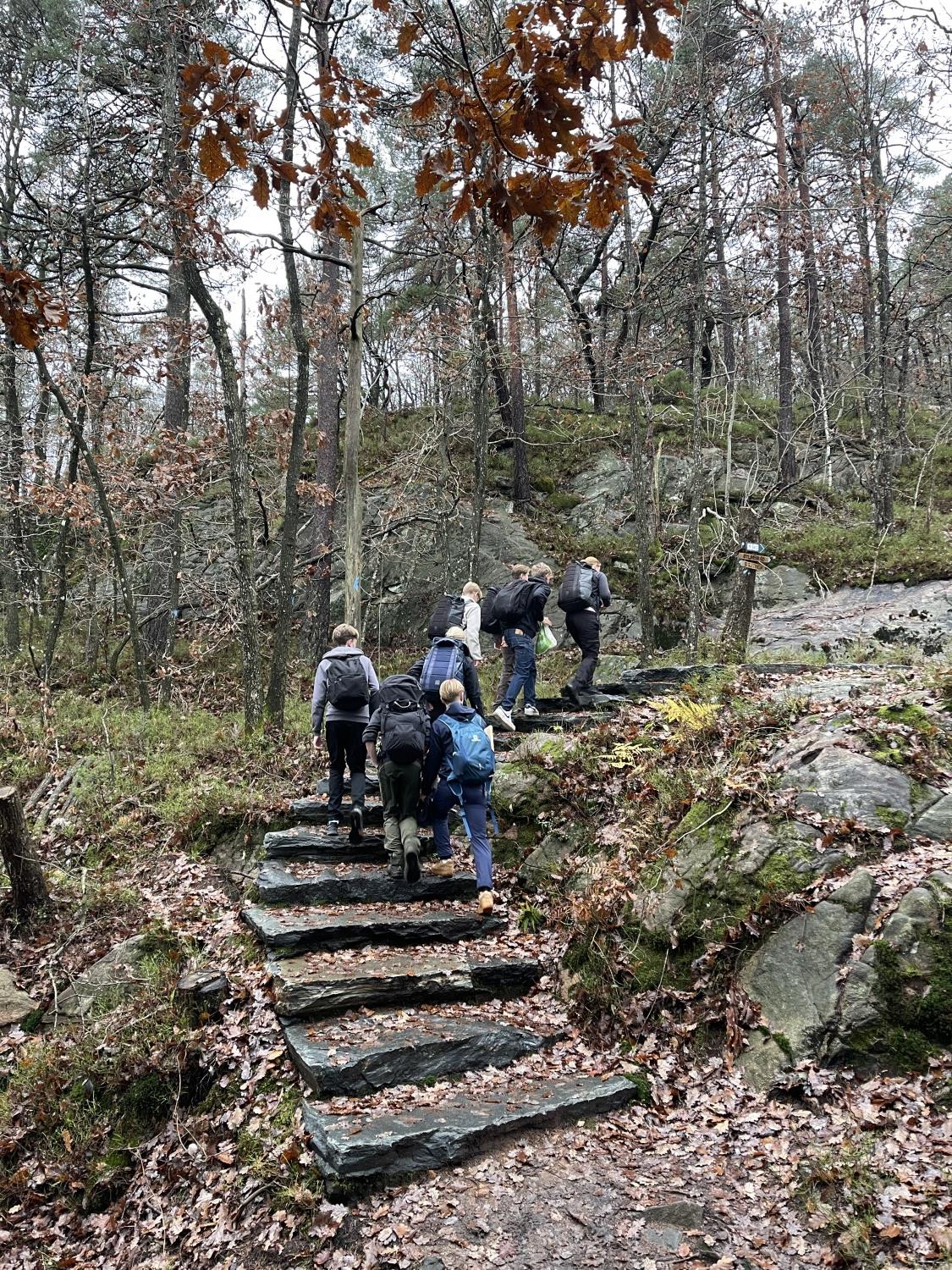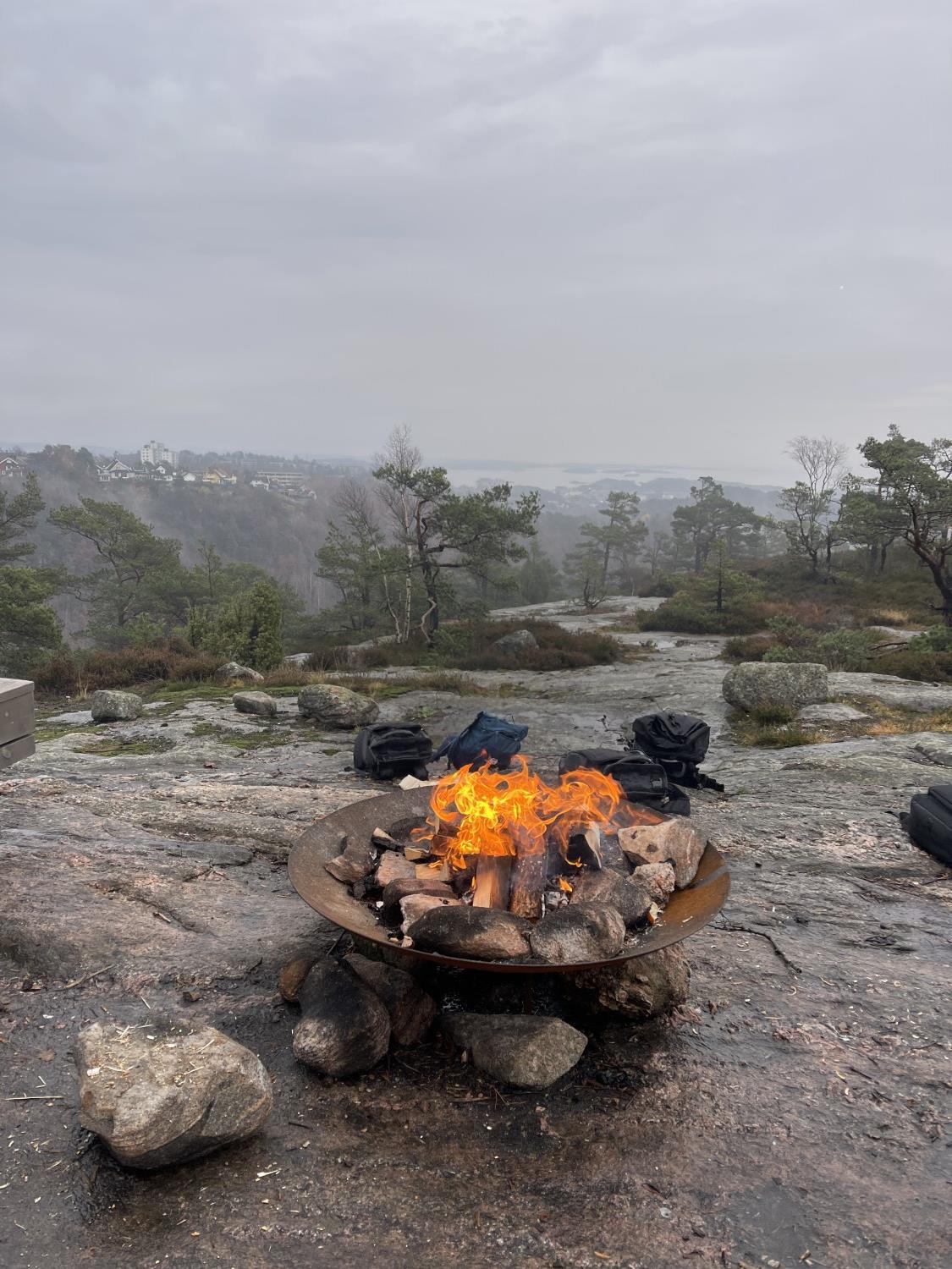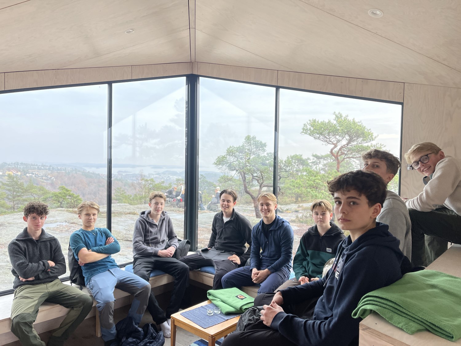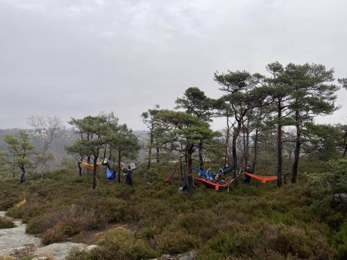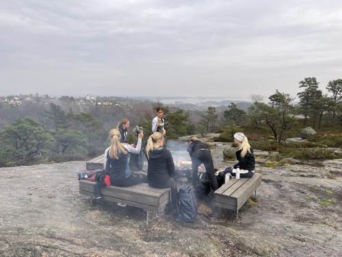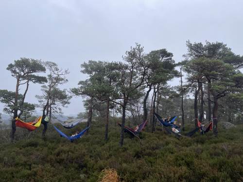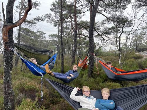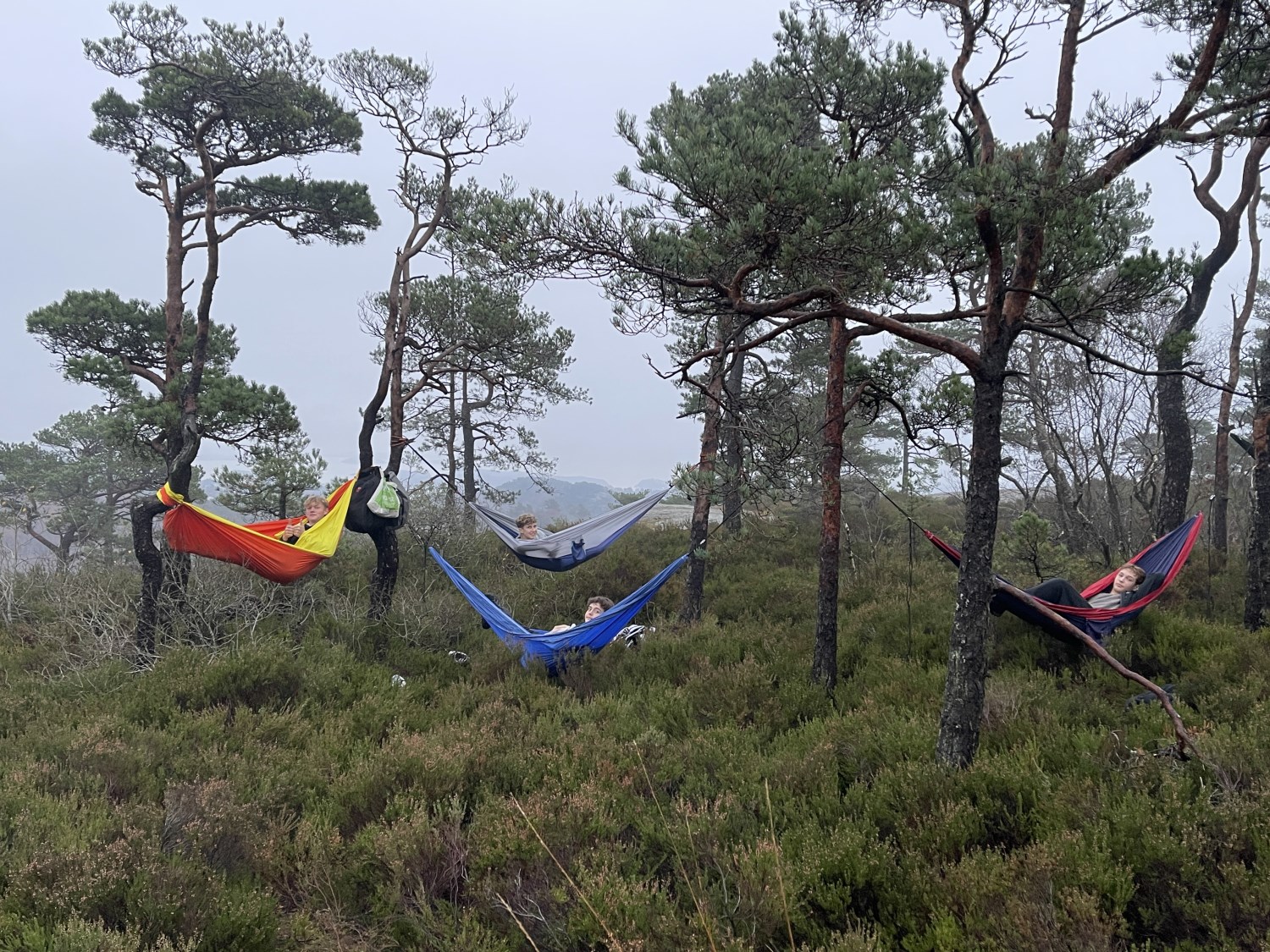 Torsdag 6. november dro friluftslivsgjengen fra 10. trinn med buss til Karuss i Vågsbygd. Derfra gikk vi i drivende tempo opp til dagsturhytta Øyliblikk som ligger ved Øylihei. Det var artig å gå de nye sherpatrappene som ble bygget i sommer. På toppen besøkte vi dagsturhytta og kjørte i gang et flott bål i bålpanna. Det ble pølser og marshmellows. Innimellom ble det tid til en liten strekk i hengekøyene.