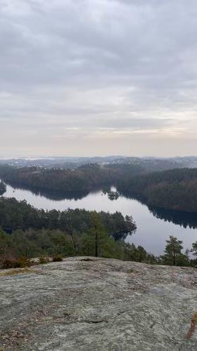 Selv om det ikke var helt klarvær, kunne vi se utover havet og skimte Grønningen fyr i det fjerne. Turmålet anbefales! Man kan både gå fra Karuss eller fra Slettheia. Det er også mulig å ta en større runde ved å starte ved Auglandstjønn barnehage eller Fidjane. Sjekk ut.no for tips.