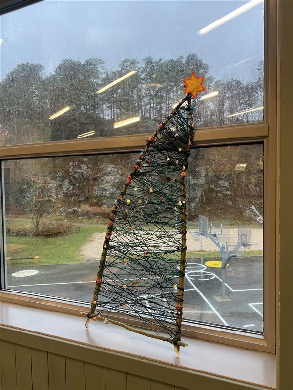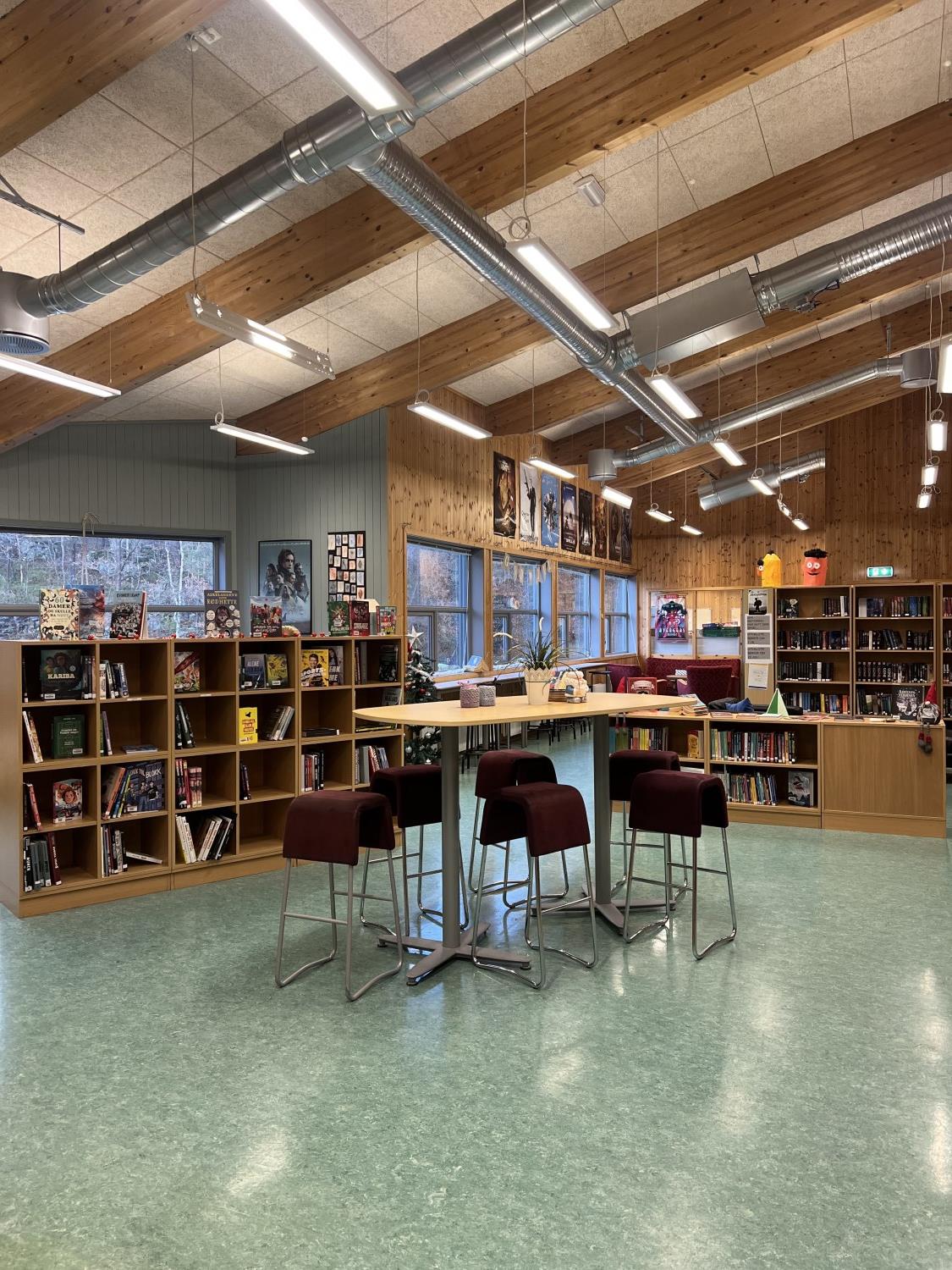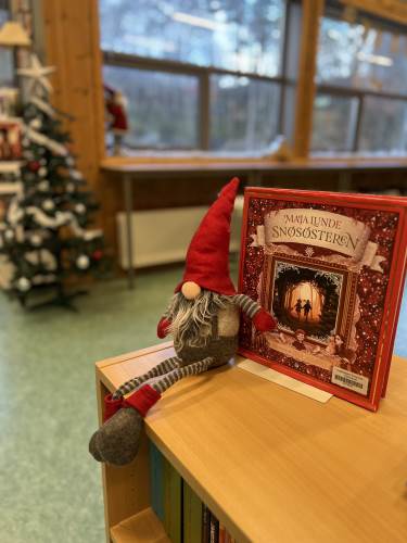 På biblioteket er det også utstilling med julebøker, og elever fra 10.trinn har vært kreative med pyntingen i år.