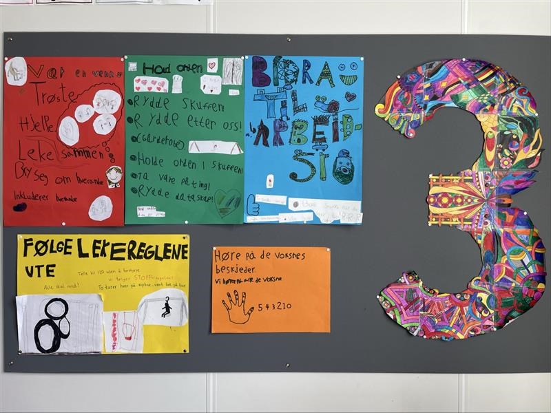 I perioden fellesskap har 3. trinn laget tipsplakater til trivselsreglene. Vi har laget to store 3-tall der alle elevene har fargelagt hver sin del fordi alle er like viktige i klassen. Vi har også jobbet med Kristiansand, sunget mange viser og snakket om kjente steder/personer i Kristiansand.