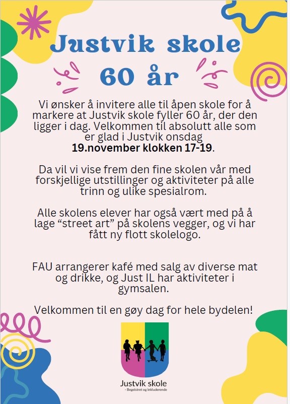 I 1965 ble Justvik skole bygget der den ligger i dag, og vi feirer 60 år med åpen skole. Elever og ansatte er i full gang med å planlegge utstillinger og aktiviteter i alle klasserom og spesialrom. Her blir det mye moro for alle aldre og interesser. Vi har også laget en ny logo for skolen, og alle elevene har malt i trappeløpene inne på skolen i et "Streeet-art" prosjekt denne høsten. Elever og ansatte vil du nok finne i sin nye skolegenser mens de synger på den nye skolesangen.