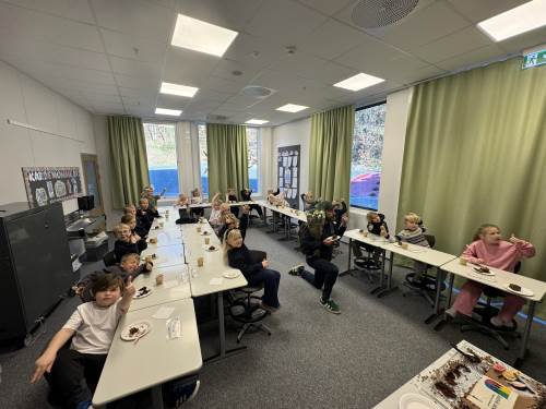På kvelden har vi feiret med åpen skole, og har hatt masse mennesker innom for å se på gamle klassebilder, flott kunst og arbeid fra elevene, og ta en kaffeprat med gamle kjente. Veldig moro at så mange tok turen, og en stor takk til foreldre og FAU som laget i stand en super kafé.