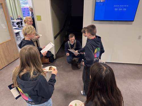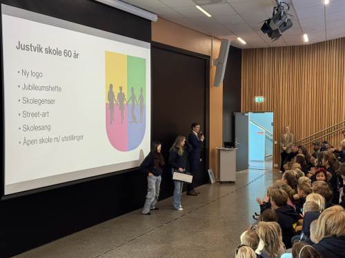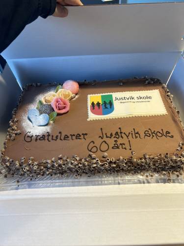 Da var endelig dagen her og vi har hatt en flott feiring av Justvik skole sine 60 år. På formiddagen har ordfører Mathias Bernander besøkt oss og fått høre den nye skolesangen. Han holdt tale, hadde med gave til elevrådet, og fikk omvisning av elever og kunstner Arne Vilhelm Tellefsen.