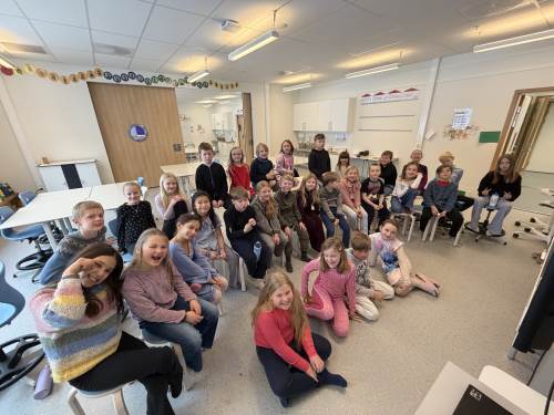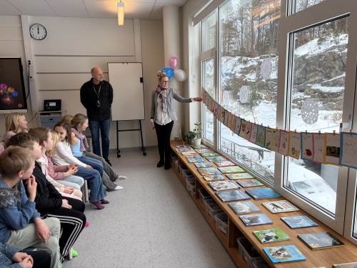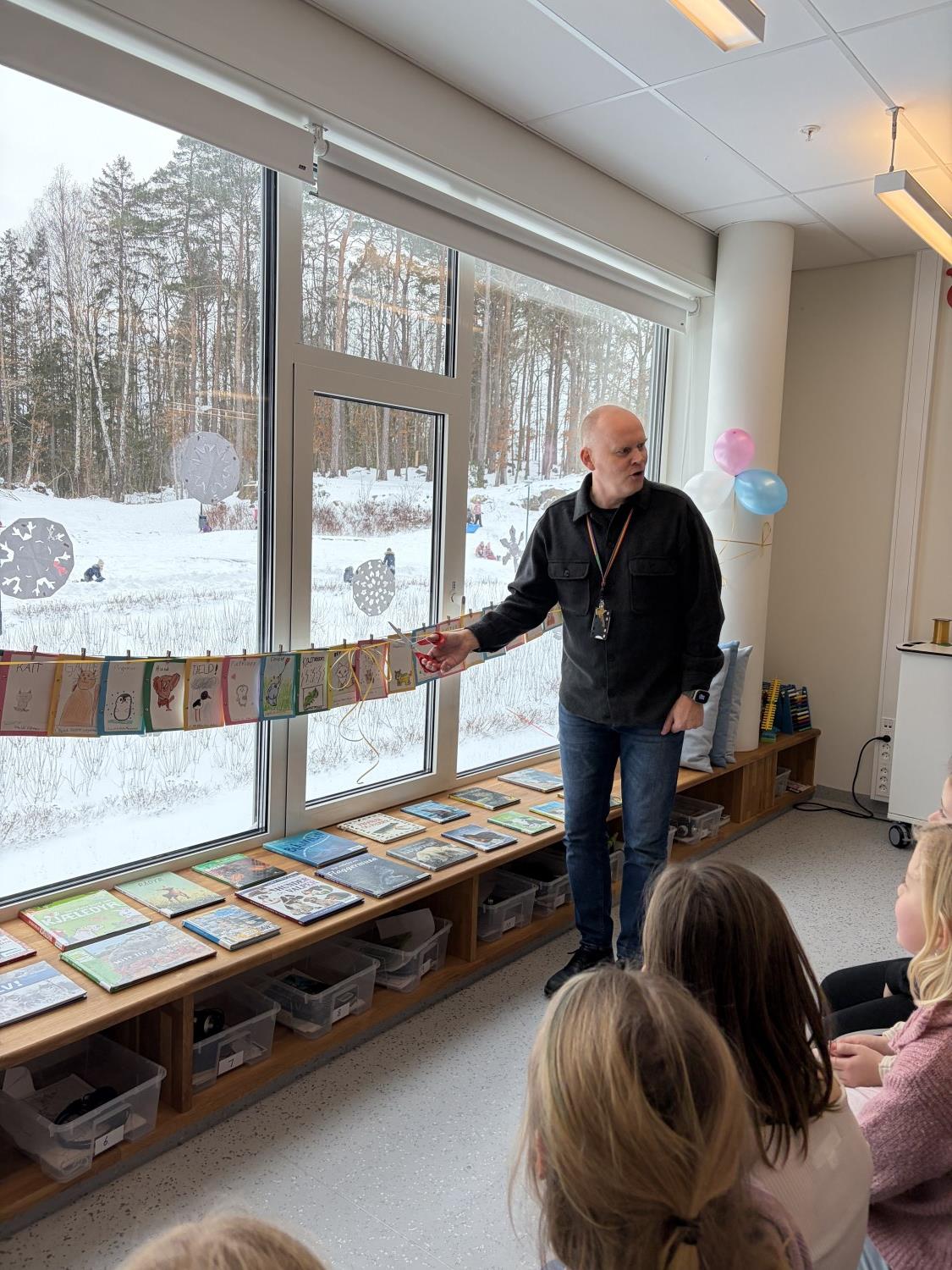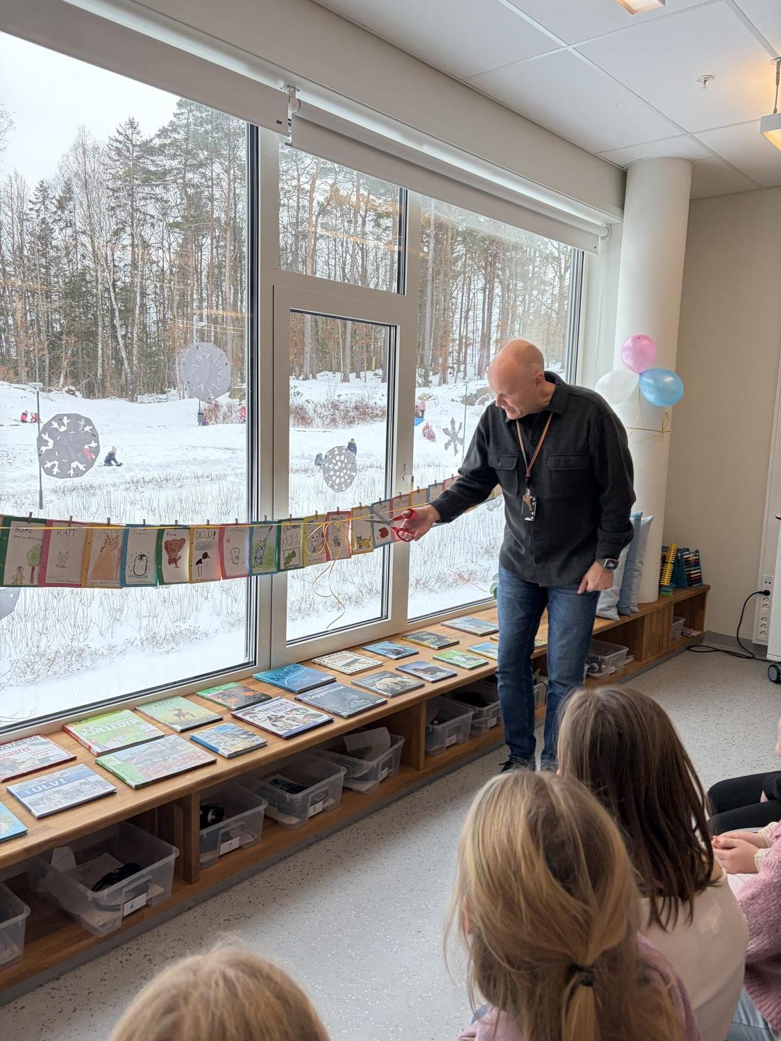 Turid Thorsen var på plass og rommet var pyntet med ballonger. Det var skikkelig god stemning i 3. trinnsrommet, da sjefen selv, selveste rektor Oddbjørn kom inn døra. Oddbjørn var buden for å klippe snora og få introdusert alle 30 faktabøkene, laget av 3. trinn. Hvert barn reiste seg når tittel og forfatter ble opplest av Turid. Barna fikk stolt motta applaus av rektor og resten av klassen. Videre feiret vi med kake og "Kompani Ord". En velfortjent avslutning på 2 ukers hard jobbing.