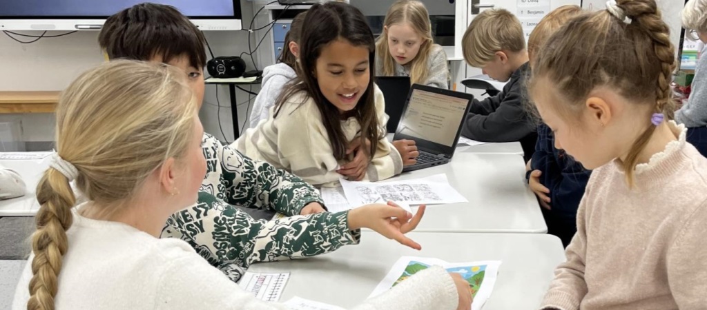 1. og 5. trinn har jobbet sammen med å skrive fortellinger.
