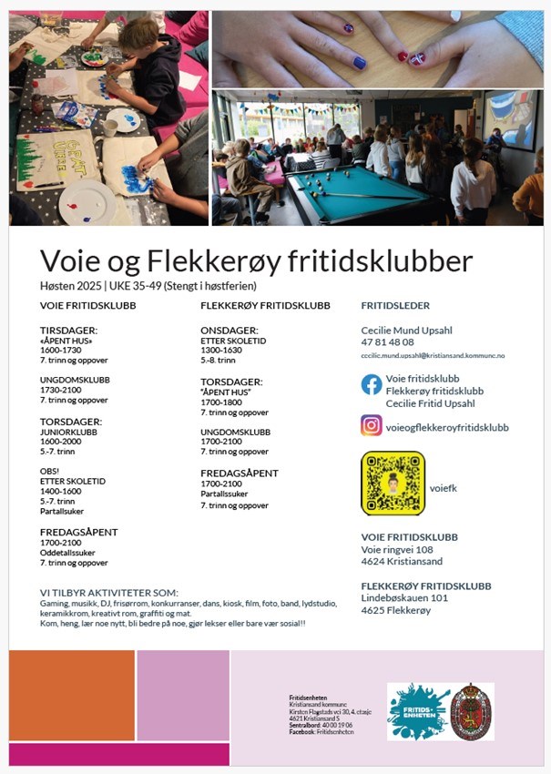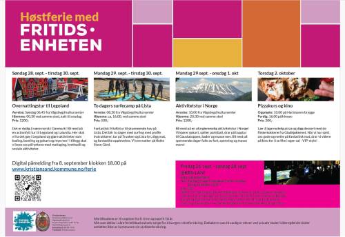 Se vedlagte plakater for informasjon om fritidsenheten sine høstferietilbud og program for fritidsklubben.