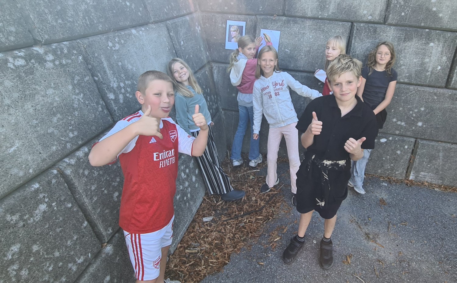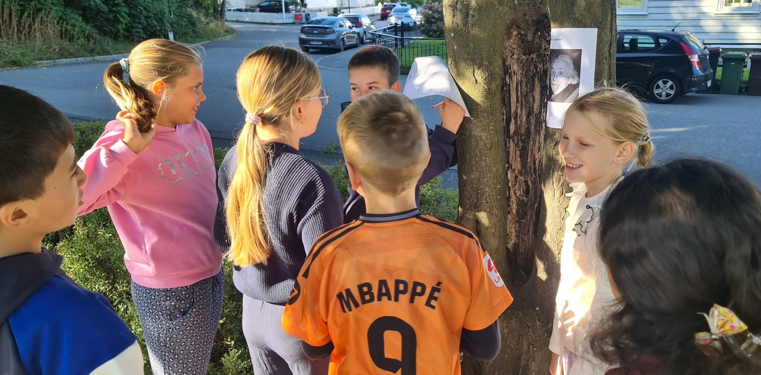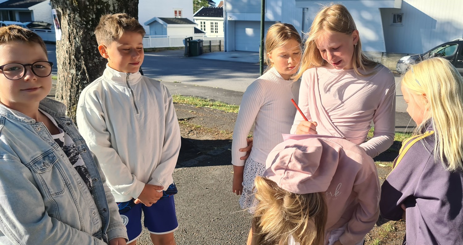 Torsdag gikk vi rundt i skolegården og fant poster med ulike spørsmål på som vi svarte på i mindre, samarbeidende grupper på tvers av trinnet
