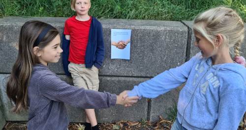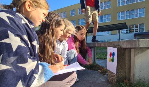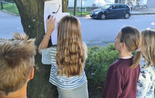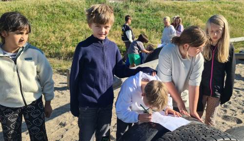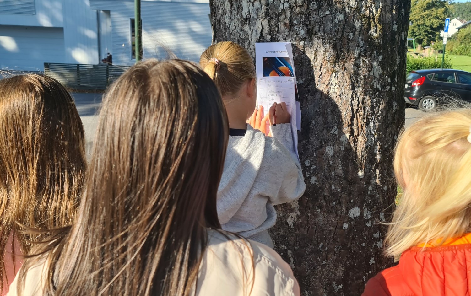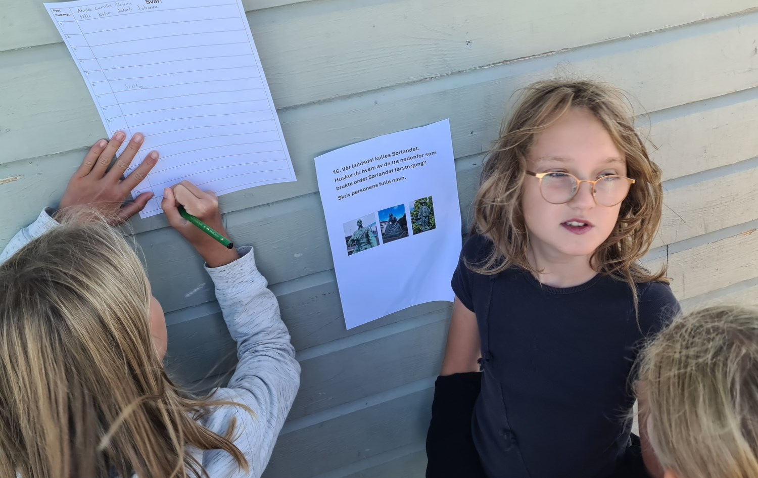 Torsdag gikk vi rundt i skolegården og fant poster med ulike spørsmål på som vi svarte på i mindre, samarbeidende grupper på tvers av trinnet