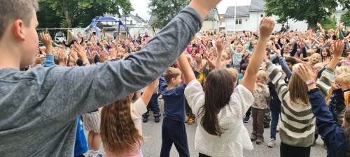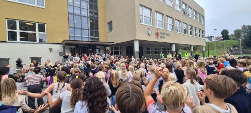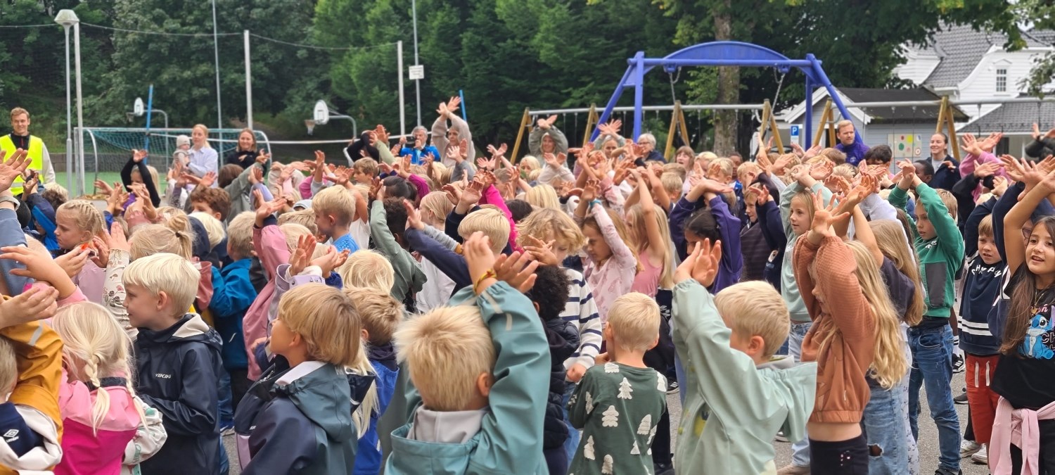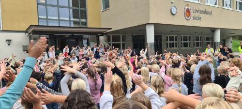 Presis kl. 12.00 ble alle med, danset og sang i skolegården på Lovisenlund i dag.