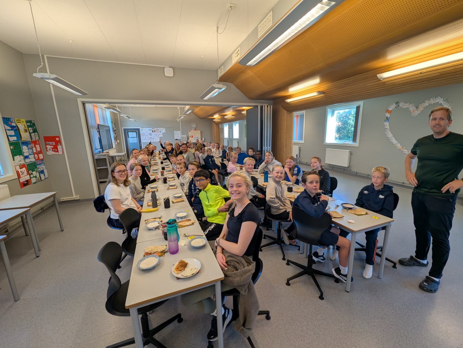 I år som i fjor har vi hatt et høyt fokus på samarbeid og lagspill de første 6 ukene av skoleåret. Vi har hatt en intern konkurranse på 6.trinn hvor elevene har samlet poeng ved å gjennomføre ulike samarbeidsøvelser, samt jobbe aktivt faglig, blant annet i lesing, regning og KRLE. Målet var at elevene skulle samle nok poeng til premie. Elevene selv bestemte hva 1., 2. og 3.premie skulle være. Vi avsluttet perioden med felles trinnlunsj hvor hele trinnet var samlet rundt to langbord og spiste mat elevene hadde laget på mat og helse, deretter løp elevene lovajoggen hvor målet var å slå fjorårets gjennomsnittstid. Elevene klarte både å slå gjennomsnittstiden og samle nok poeng til 1.premie. Dermed feiret vi med pysjamas-dag, film og popcorn på tirsdag denne uka.