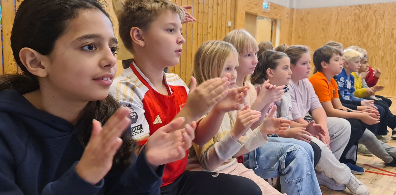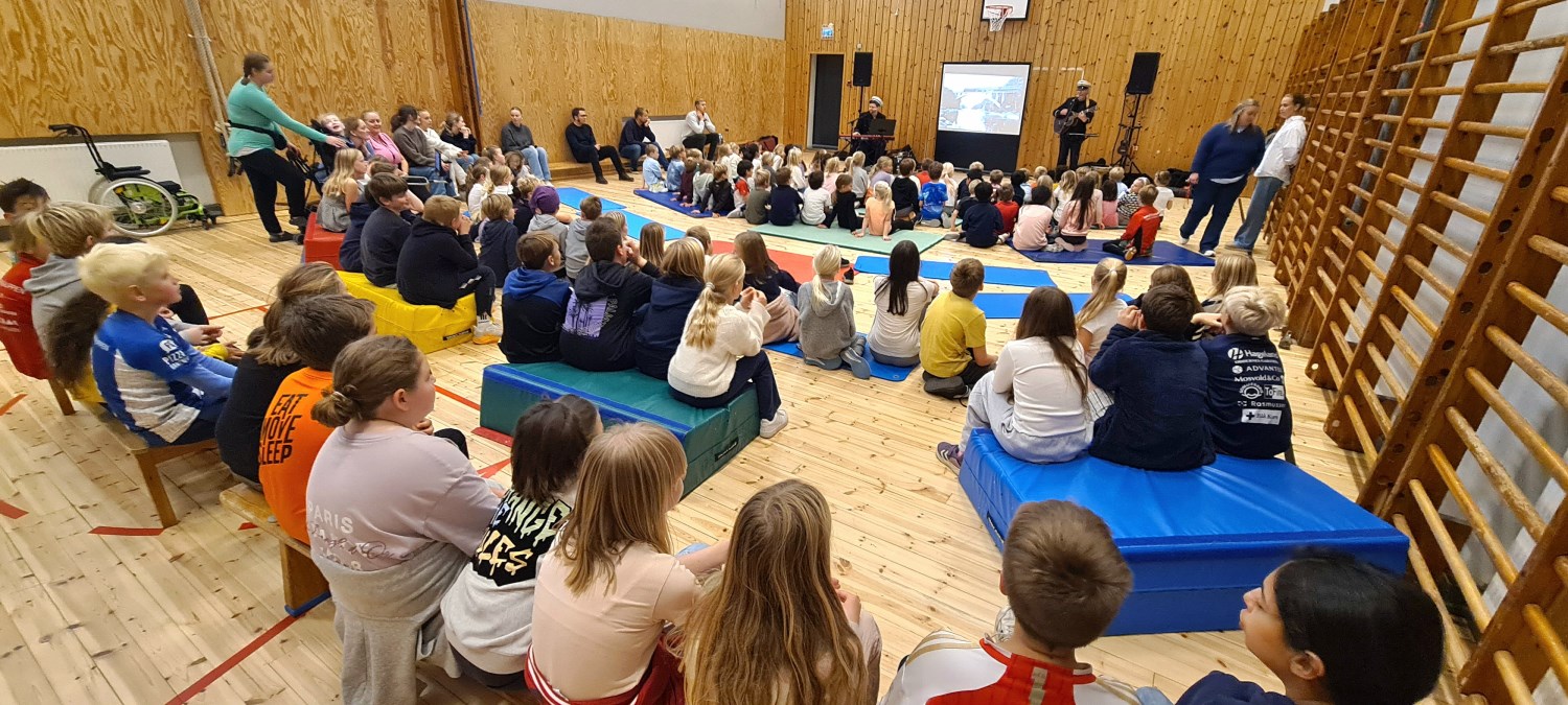 Rasmus Solem (keyboards, vokal, lydkulisser) og Tore Thomassen (gitar, vokal, ukulele, banjo) levendegjorde historien gjennom sanger, rim og regler, lyd og bilde, og elevene ble invitert til å synge med. "Dere på Lovisenlund skole er de beste til å synge", fikk elevene fra 3. og 5. trinn høre da jeg var tilstede og fotograferte under en av forestillingene satt opp for 1.-5. trinn.