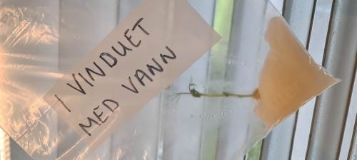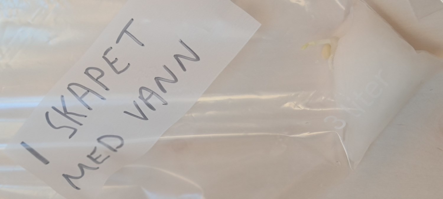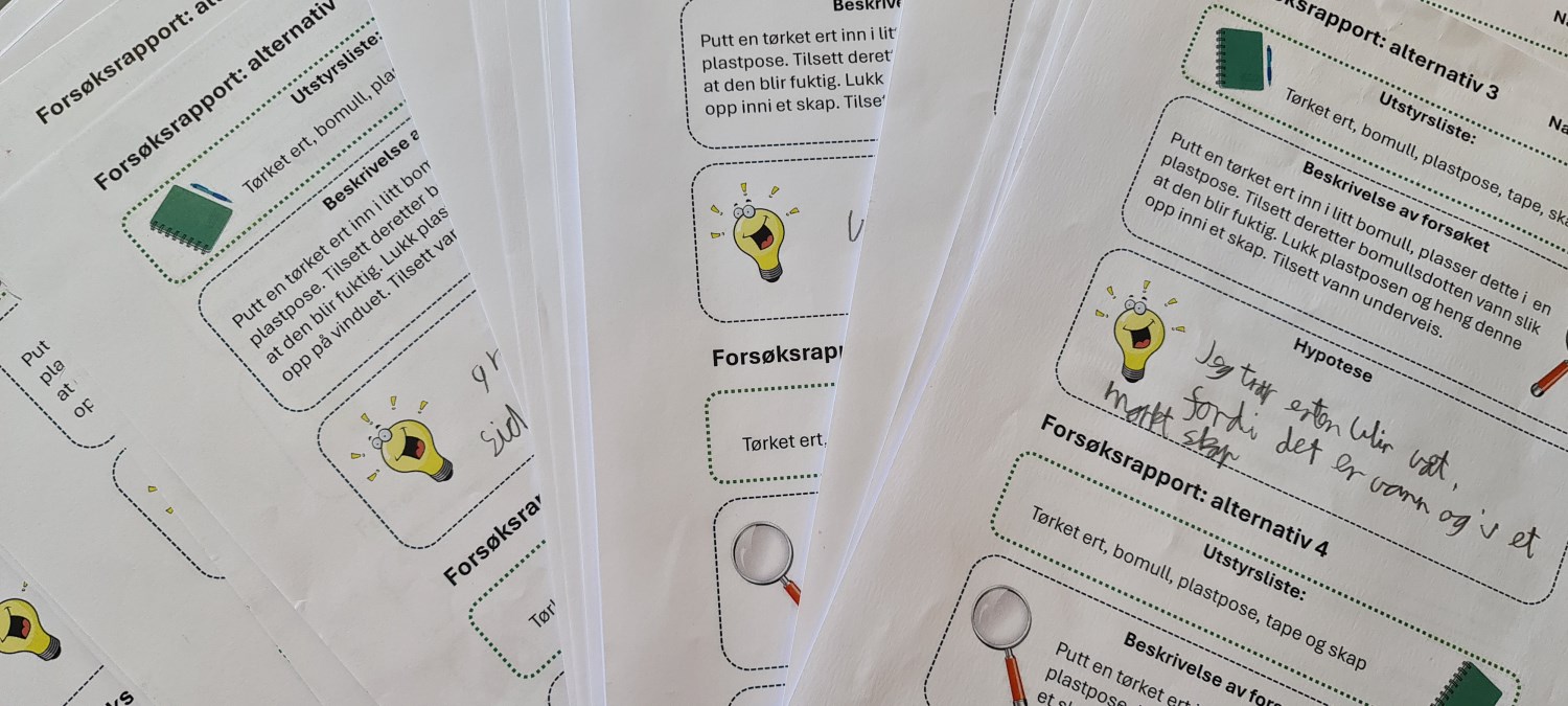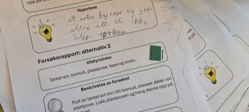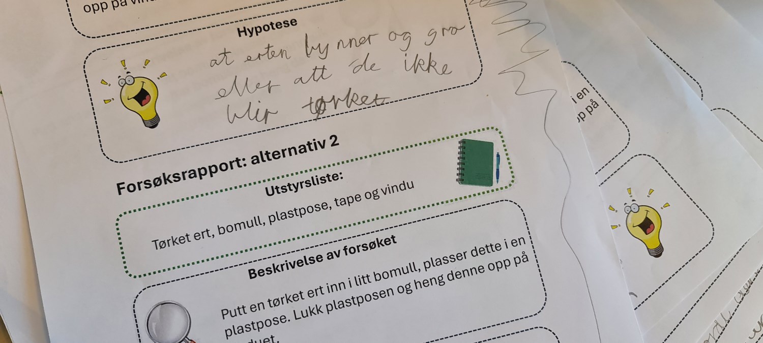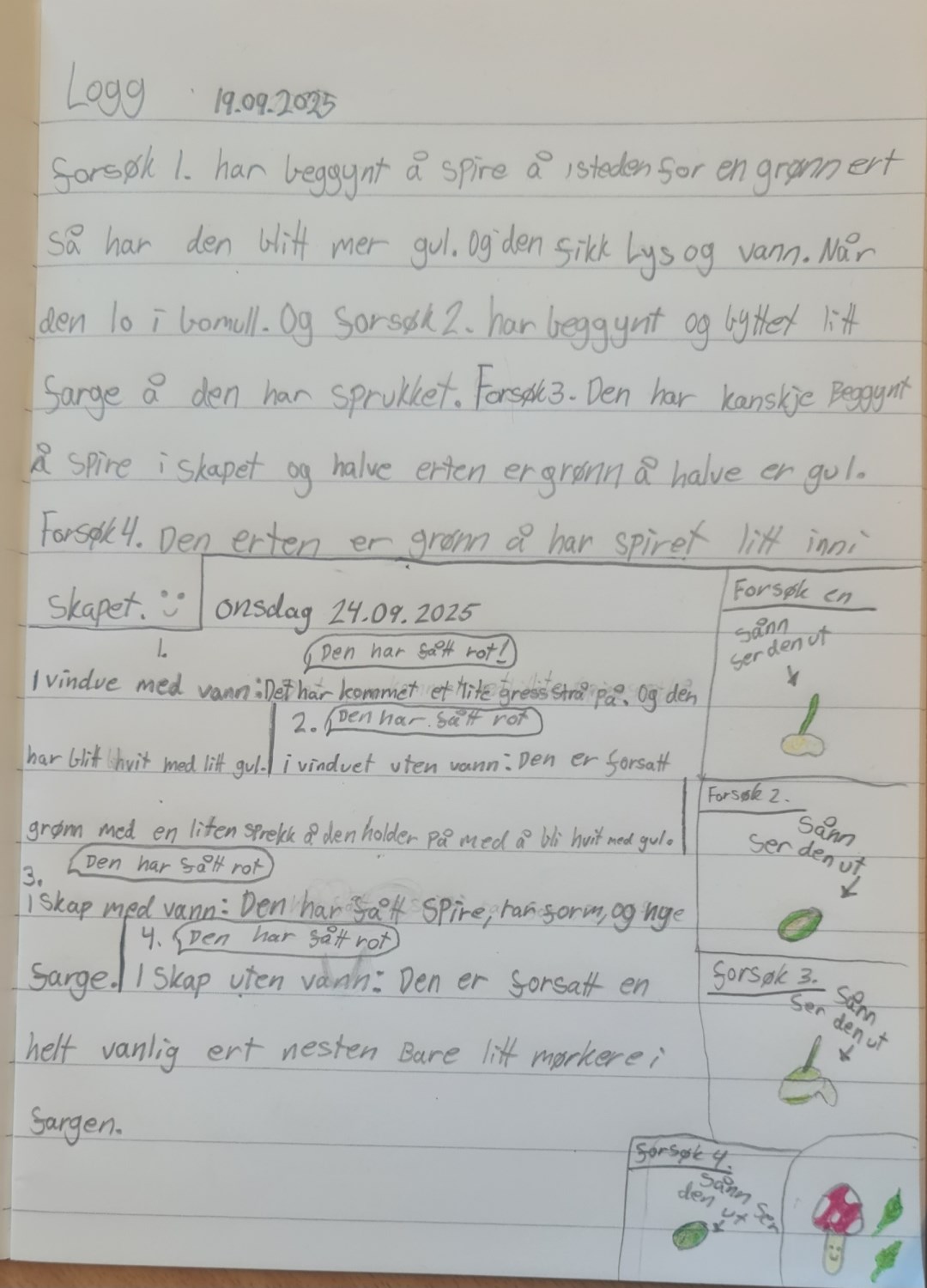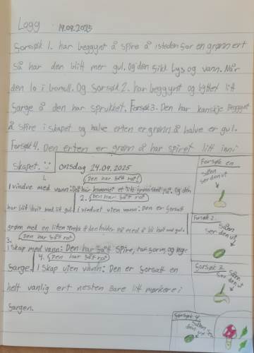 Vi gjorde forsøk med en tørket ert som ble lagt på en bomullsdott i en zippet plastpose; noen med lys og vann, lys uten vann, og i mørke med og uten vann. Vi lagde hypoteser og fulgte forsøket gjennom flere uker. Noen av hypotesene (hva vi trodde kom til å skje) stemte. Andre stemte ikke. Hva som skjer videre nå som spirene har blitt til planter som står i kopper med jord i både lys og mørke, gjenstår å se.