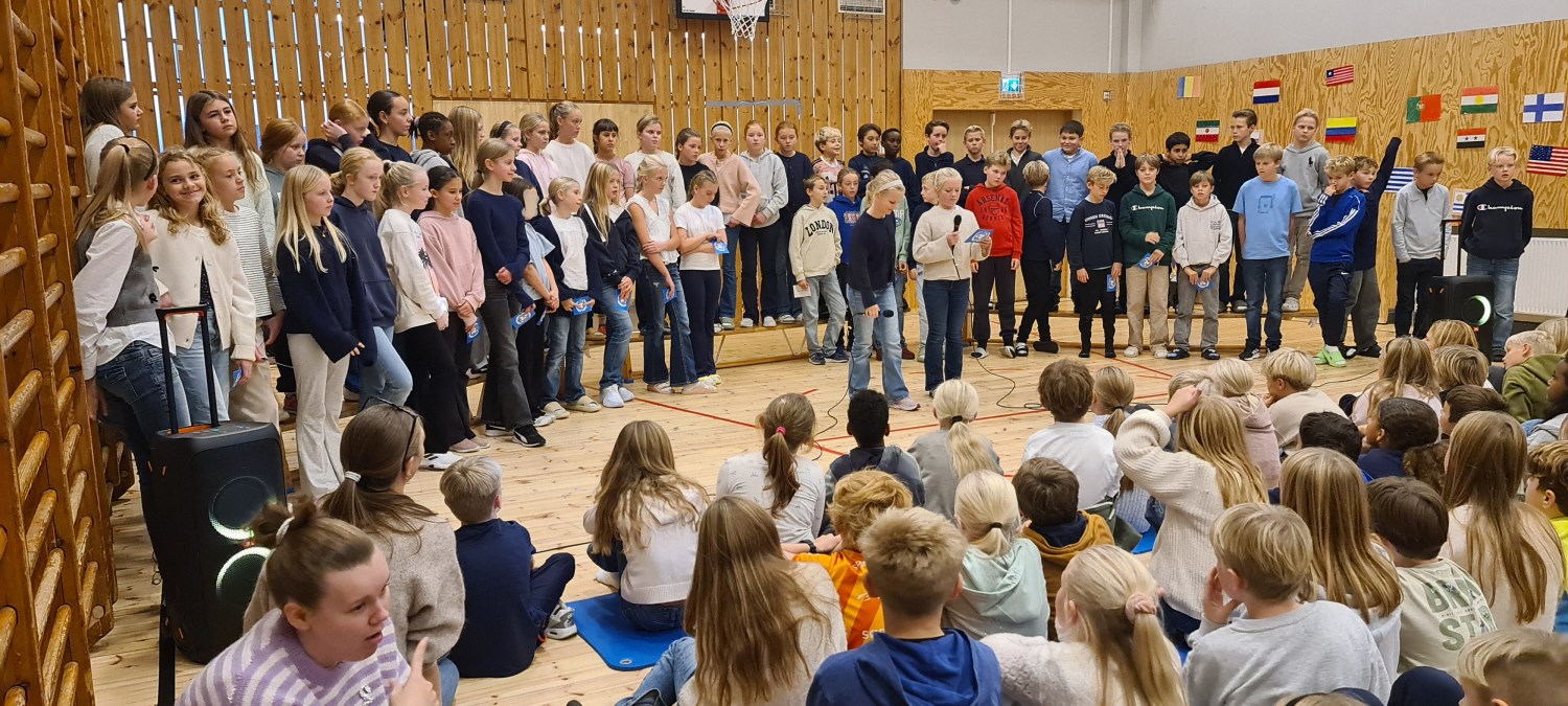 Vi ble ønsket velkommen allerede på vei inn i gymsalen av et praktfullt skue av flagg som markerte nasjonalitetene til både voksne og barn ved skolen. Deretter ble det både felles sang på norsk og engelsk, i tillegg til at elever blant arrangørene fortalte om både FN og barns rettigheter. Dyktige konferansierer, dyktige solister, og nydelige forsangere for felleskoret. En samlende opplevelse for oss alle, og et flott, integrert innslag i temaperioden "Vi i verden"!