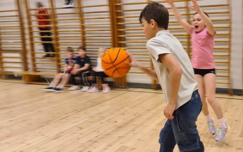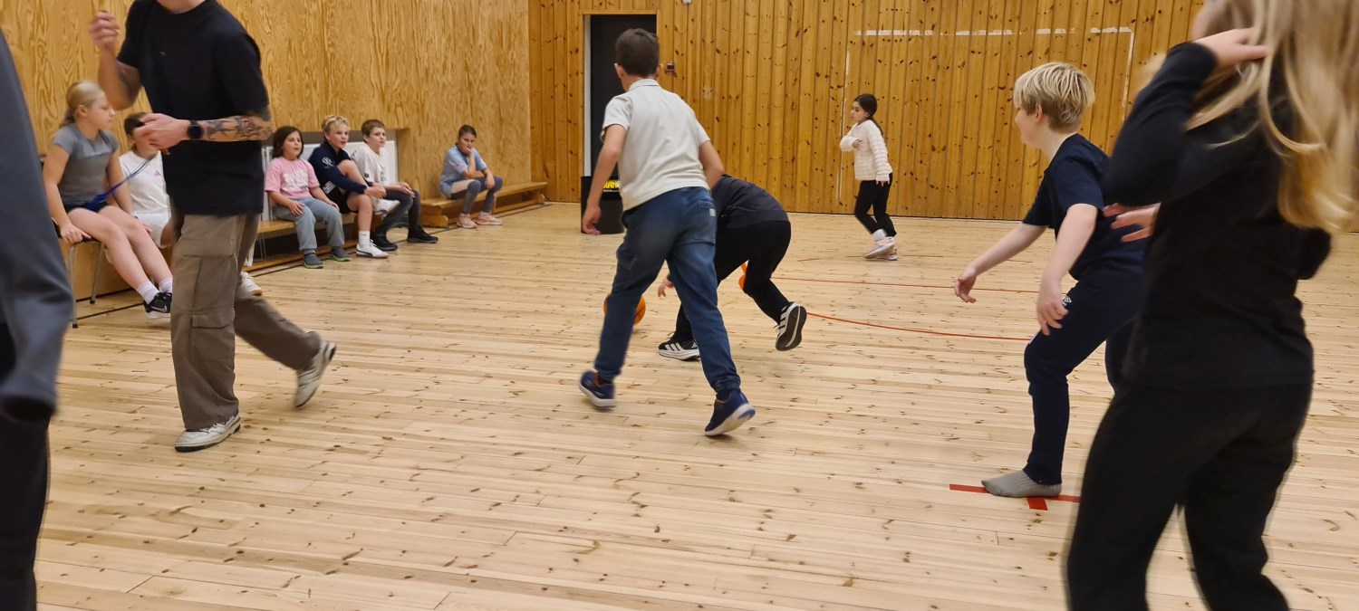 Iherdig innsats og høyt aktivitetsnivå med innebandy og basketball i kroppsøving.