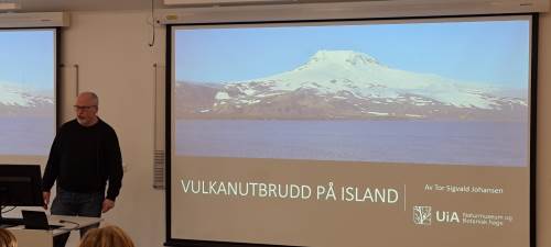 Under foredraget om vulkanutbrudd på Island, kjente vi på å vite en god del fra før. Anne-Lise viste nemlig bilder og film fra Island fra hennes opplevelser med nettopp vulkanutbrudd, besøk i byen Grindavik og vi fikk studere lava på nært hold fredagen før vi var på UiA. Likevel lærte vi noe nytt også, som vi kunne koble til det vi visste fra før.