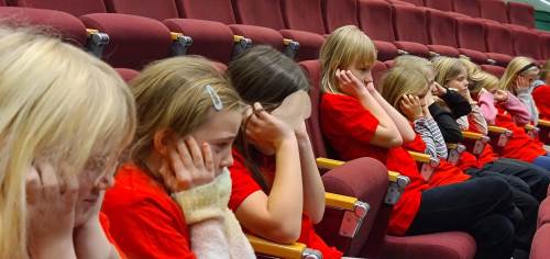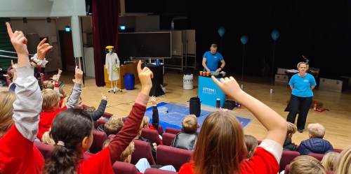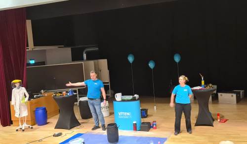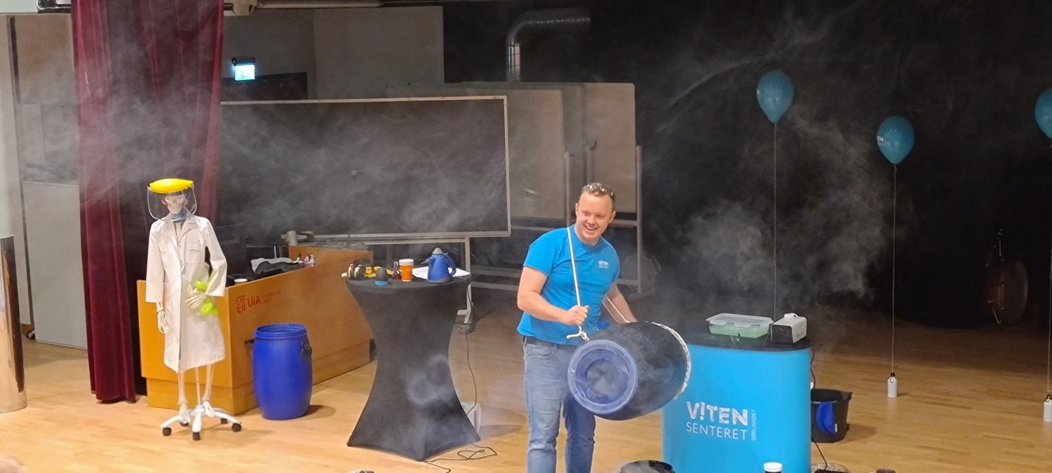 Vi startet med å se et forrykende vitenshow med kjemiske reaksjoner, eksplosjoner og røyk. Tre av jentene fikk nærkontakt; to på scenen og ei med kopp på hodet i setet. Imponerende!