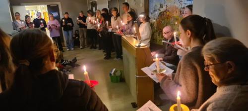 Mandag morgen kl 08.10. Skolens voksne med tente lys og stjerner i blikket utenfor Aulaen. Det er advent og julesang i trappa.