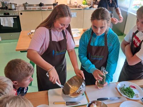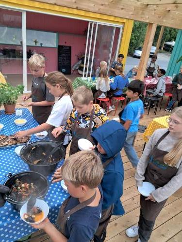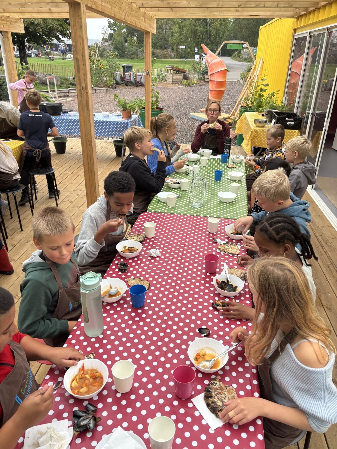 Første dagen lærte Helene og Nikolai oss om grunnsmakene, spiselige vekster, hvordan man lager smør, to ulike knivgrep, hvordan se forsjellen på dårlige og gode blåskjell og tilbereding av mat på bål. Denne dagen laget barna en blåskjellgryte helt fra bunnen av. NAM!
