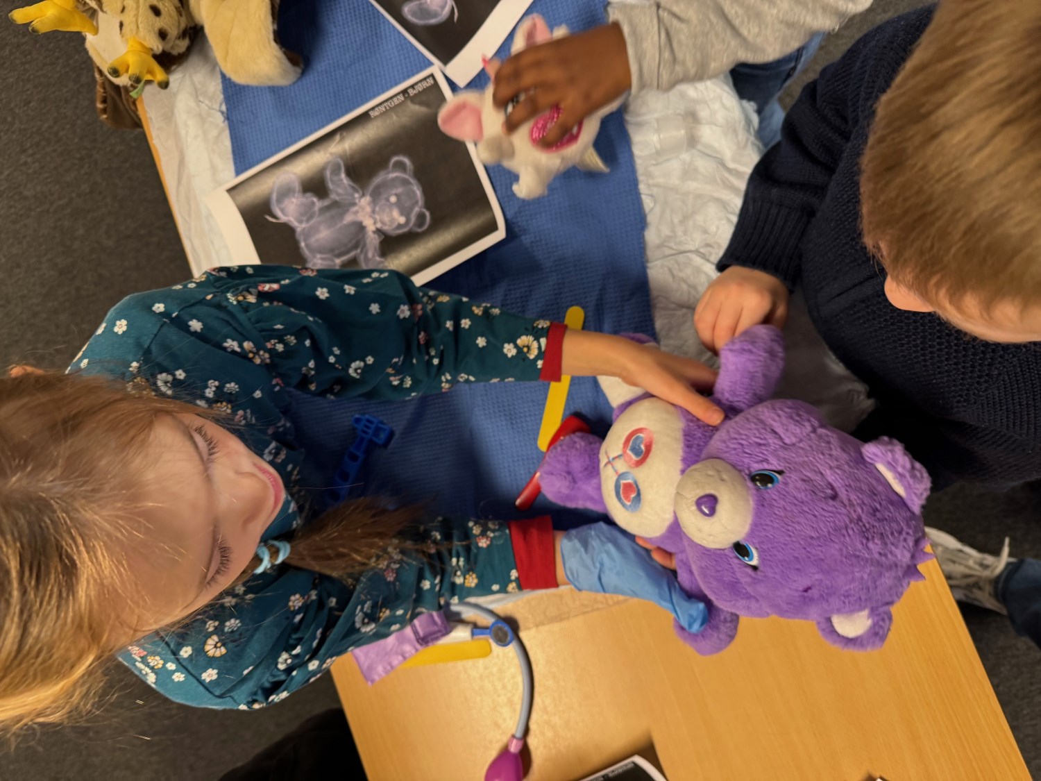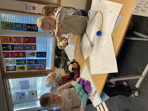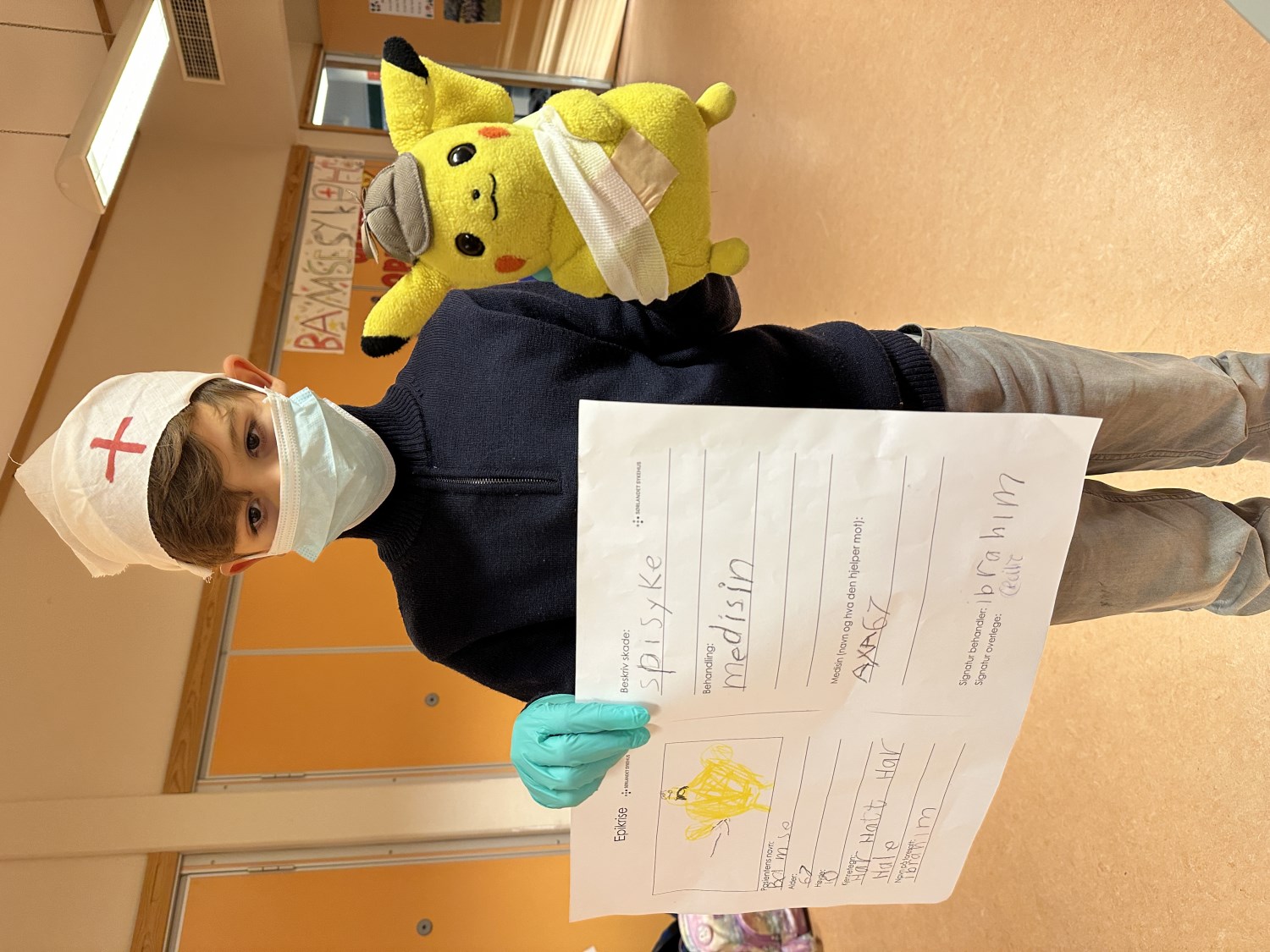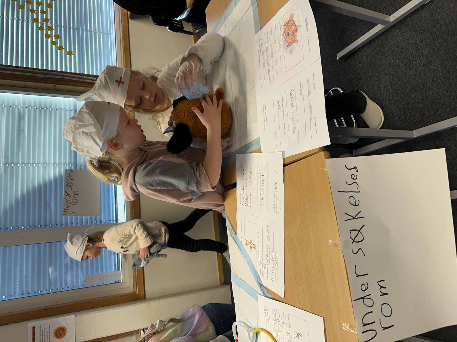 I dag har vi hatt bamsesykehus på 2.trinn. Elevene forberedte dagen i går. De laget plakater slik at vi kunne vite hvor de ulike avdelingene på sykehuset var. Vi hadde venterom, eget røntkenrom, behandlingsrom, undersøkelsesrom og apotek. De fikk lov å omorganisere hele klasserommet og være kreative. Utstyret ble lagt på plass på riktig rom og elevene gledet seg veldig. Fredagen kom og bamsene lå i sekken. Først måtte de lage en EPIKRISE av pasientene sine (bamsene) og notere viktige ting ned slik at behandlingene kunne gjennomføres. Bamsene måtte ta rønktenbilder og gå gjennom undersøkelser for å finne riktig behandling. Det var mange som dessverre hadde brekt noe og måtte ha bandasje. Andre fikk tatt ulike vaksiner og noen måtte gå på sterke smertestillende. Dette fikk de tak i ved å lage en resept og kjøpe på apoteket. Elevene var engasjerte og kreative i sin lek med bamsen. Kjedelig var det når vi måtte avslutte. Vi legger ved noen bilder, kos dere.
