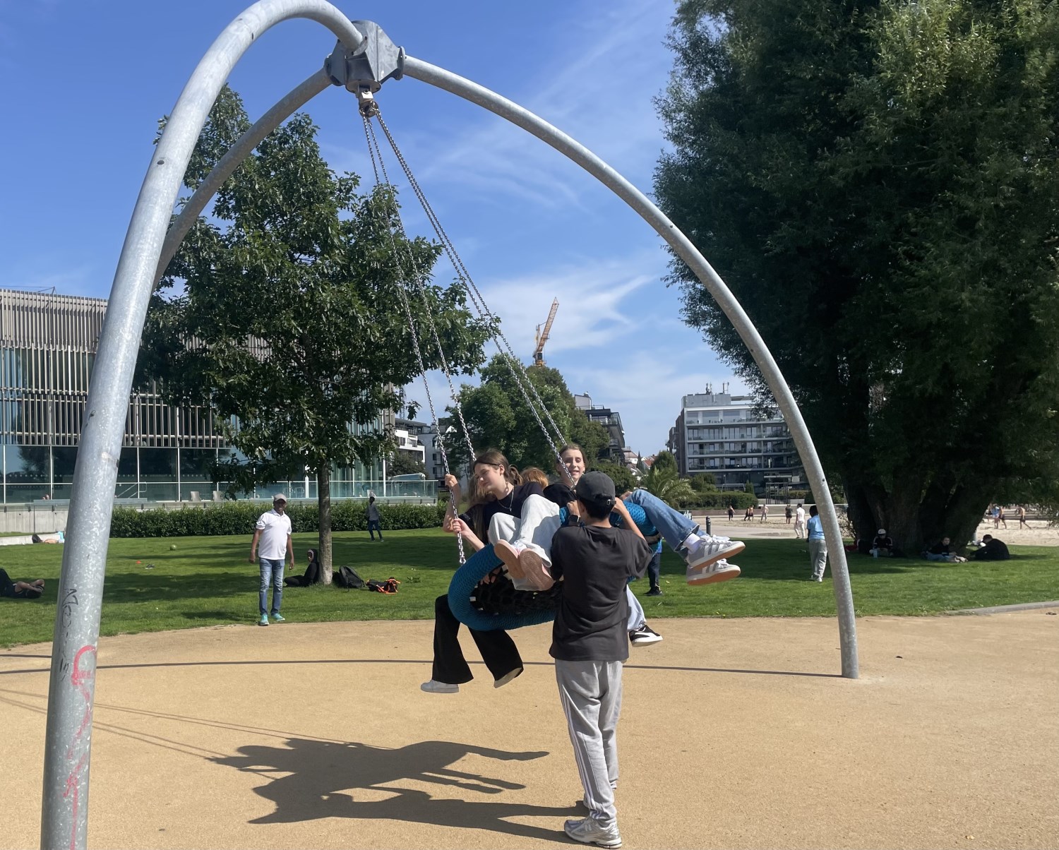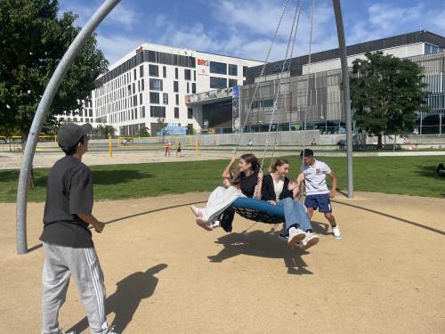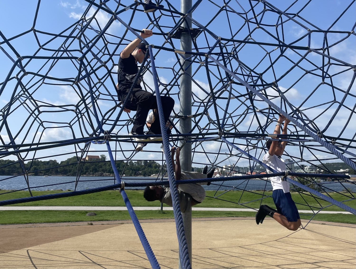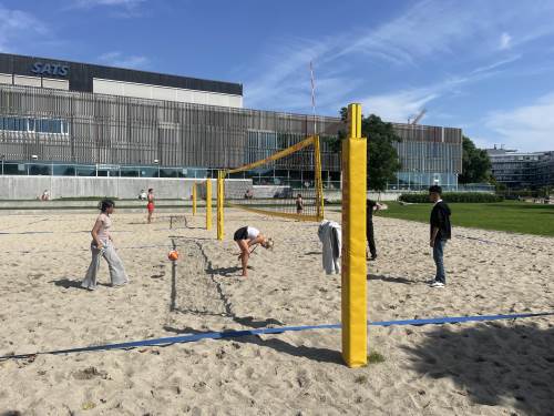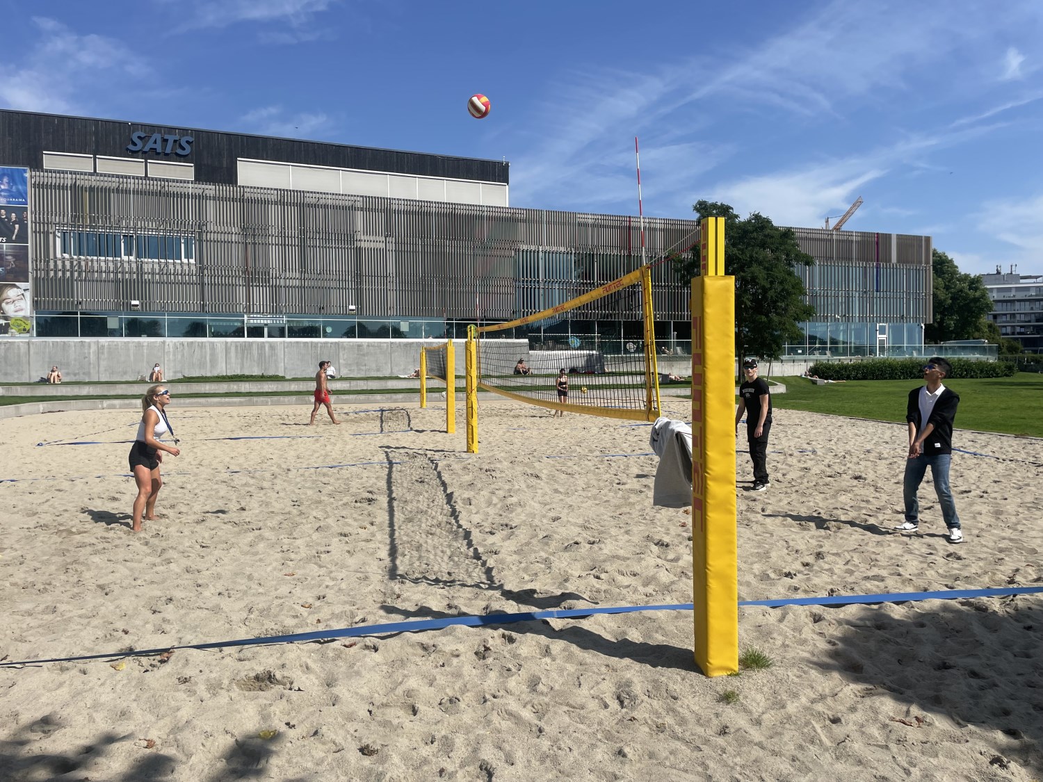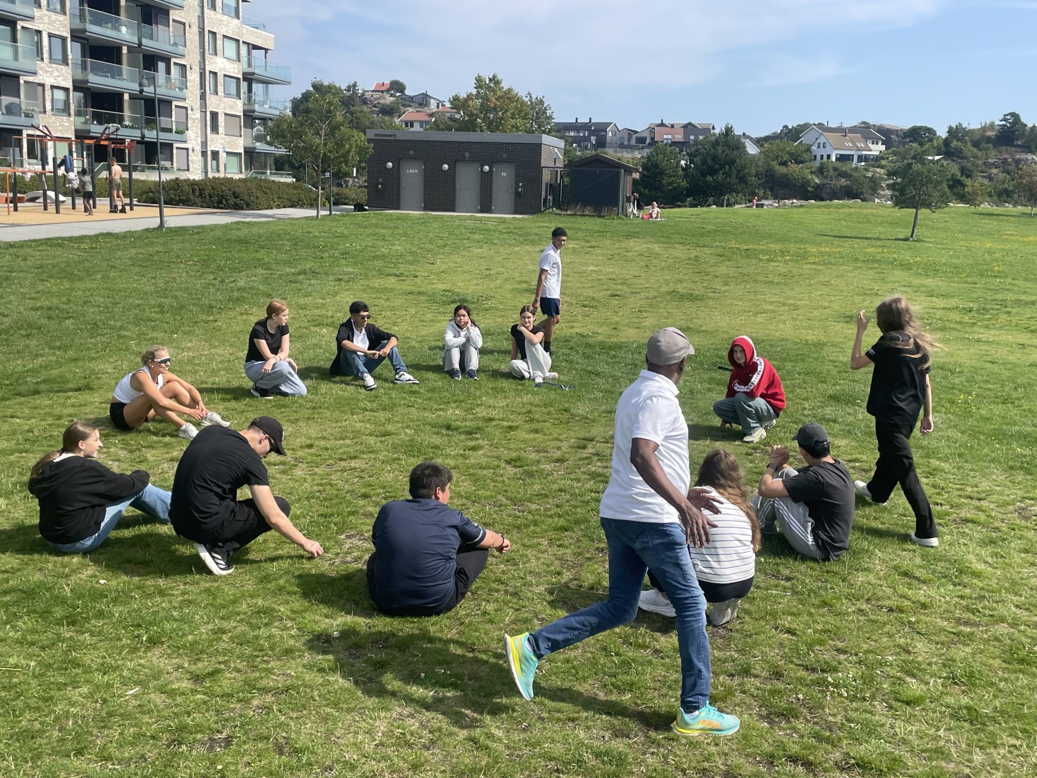 ansikter møttes til uteskole, navneleker, volleyball, fotball og til og med