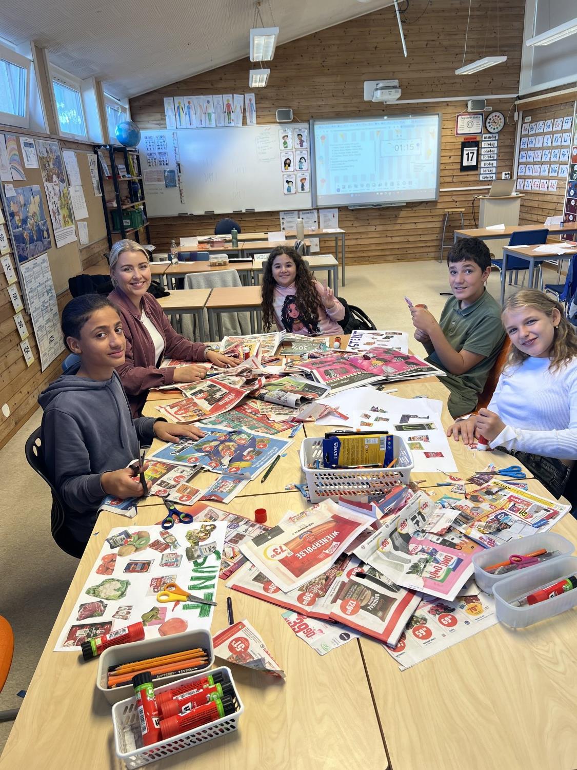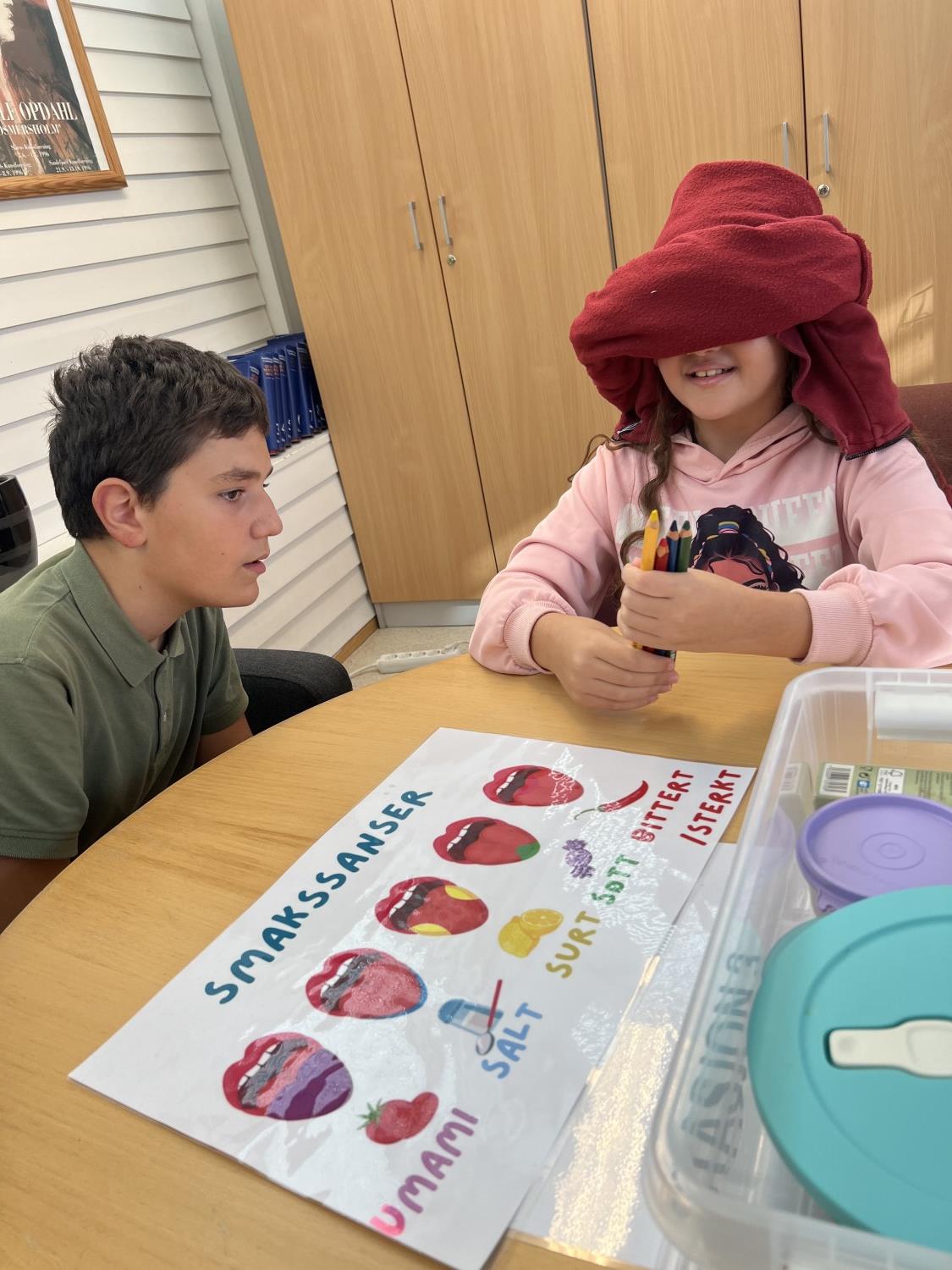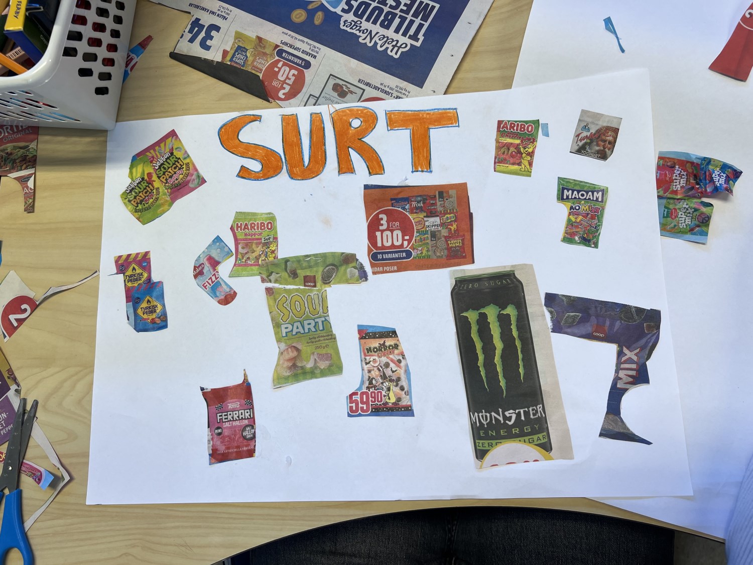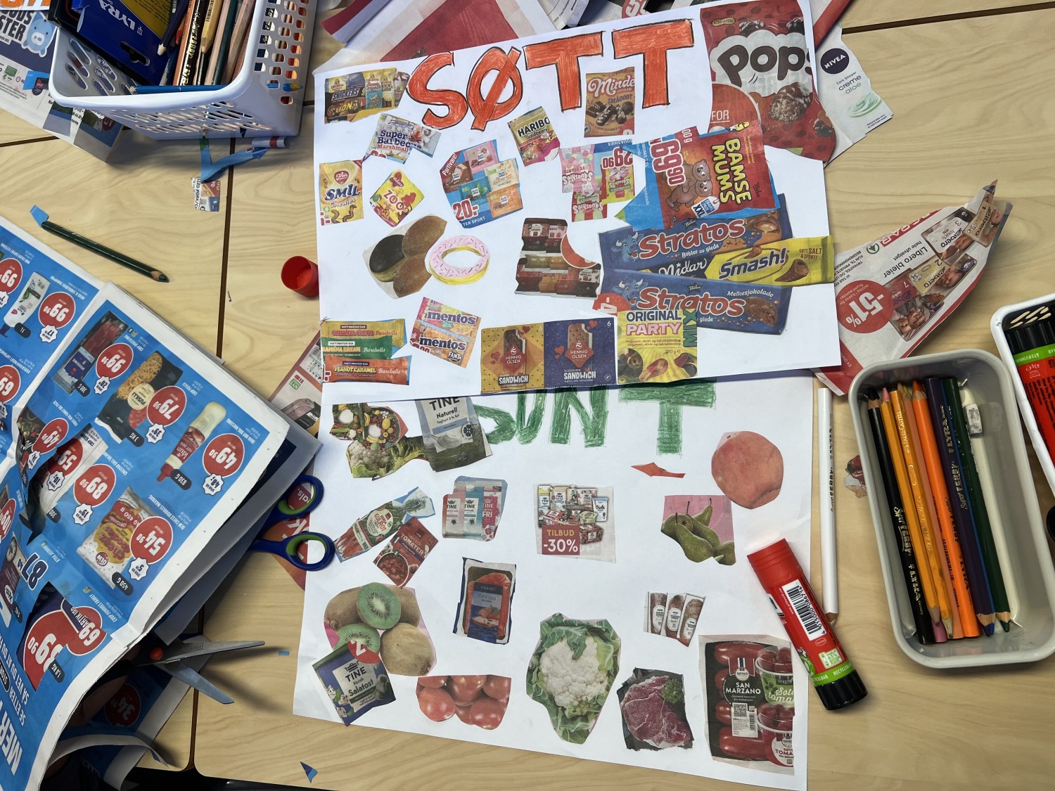 Vi har lært sanger om mat, hatt smakstester i blinde og laget plakater om ulike matvarer og drikke.