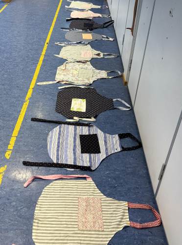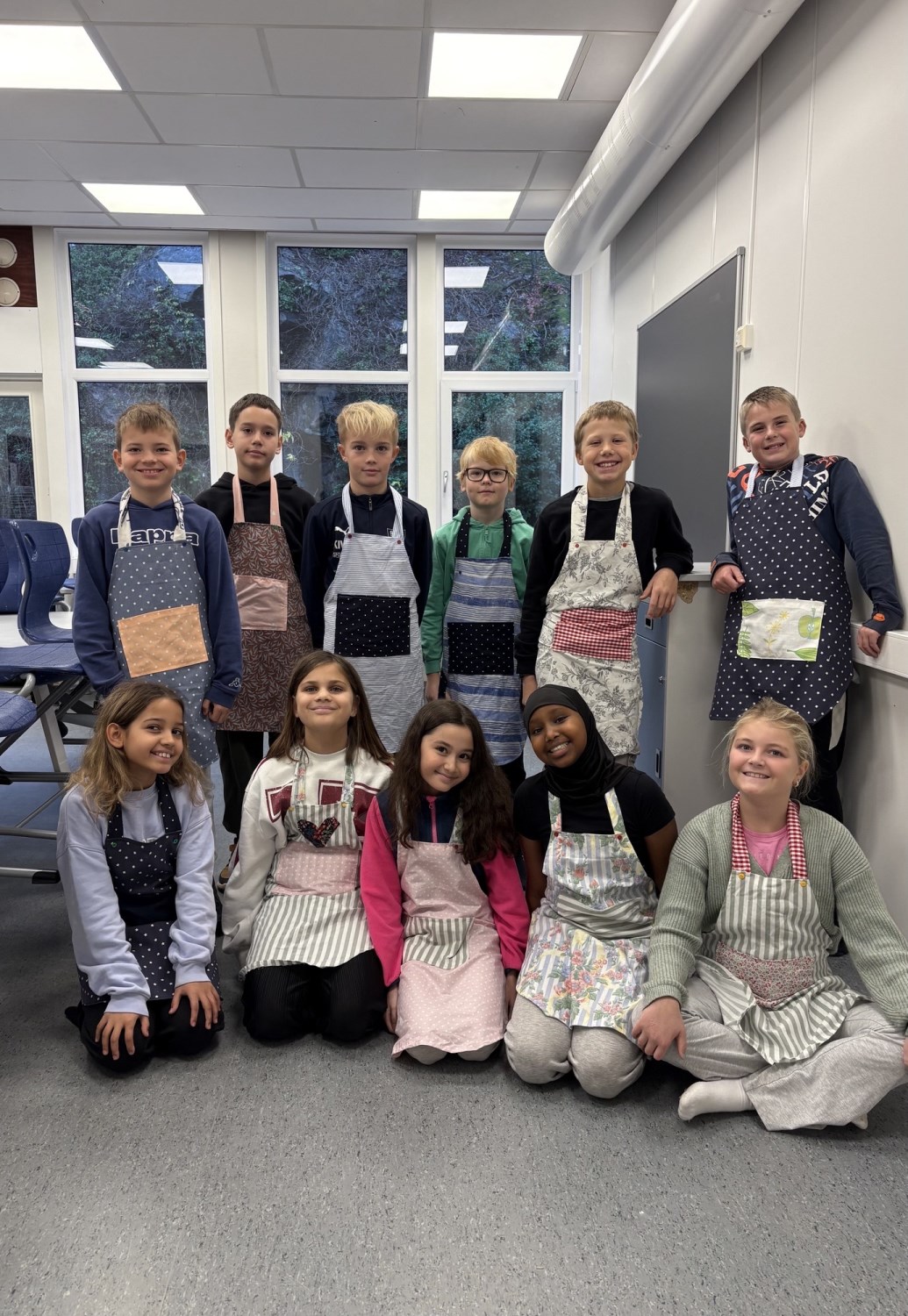 Da er første gruppe ferdige med sine forklær. De har jobbet og stått på, og vi synes de ble ganske så fine!