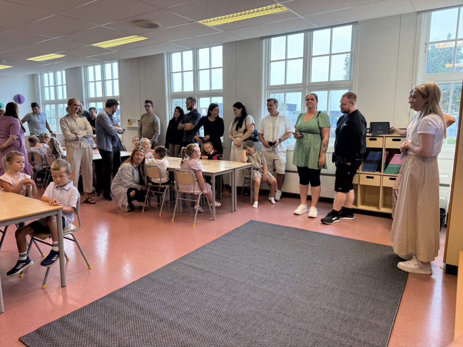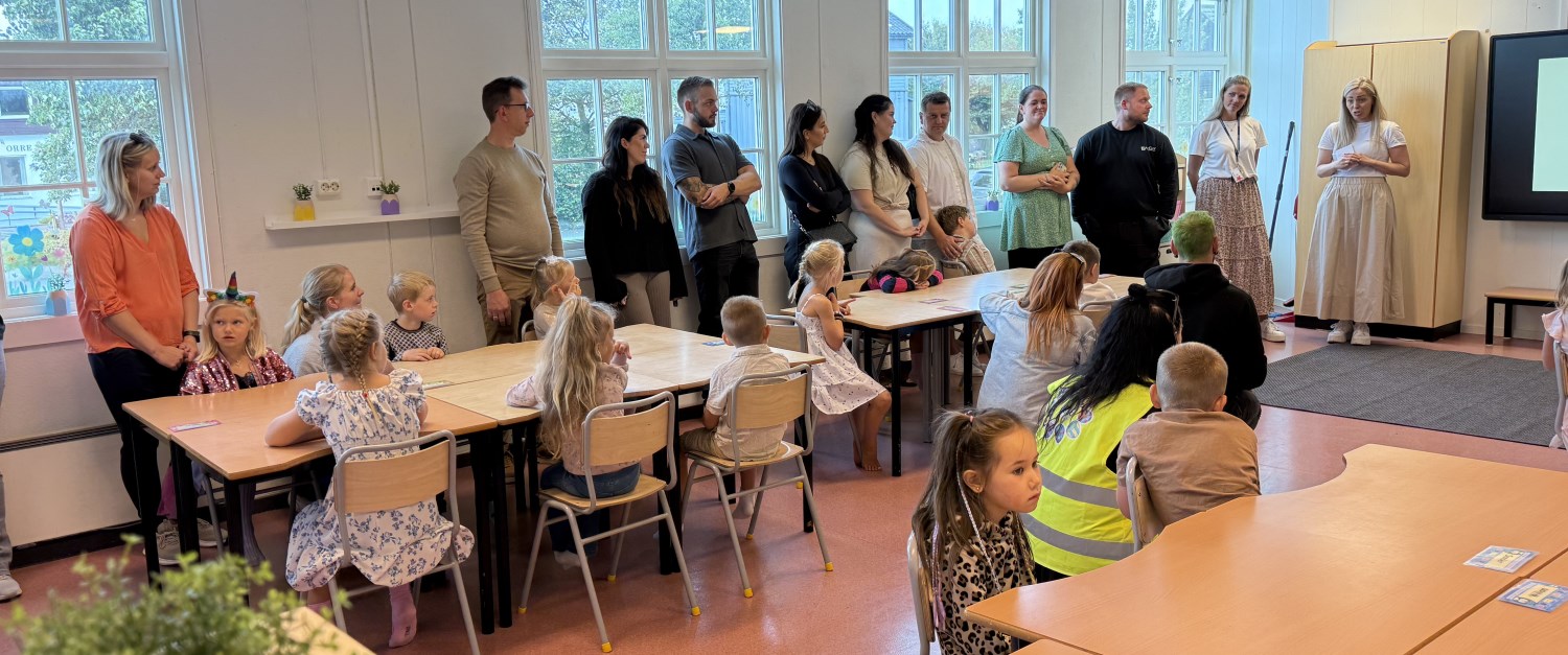 Norske flagg og raud laupar var klare til å ta i mot den fine gjengen som me er så heldige å får låna i sju heile år på Orre skule. Rektor ønska elevar og foreldre velkomne, og før me entra klasserommet fekk me foreviga eit bilete av dei skuleklare førsteklassingane som stråla med fine førsteklasse-klede og ny skulesekk.