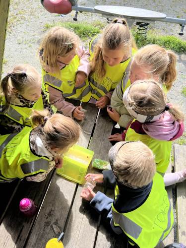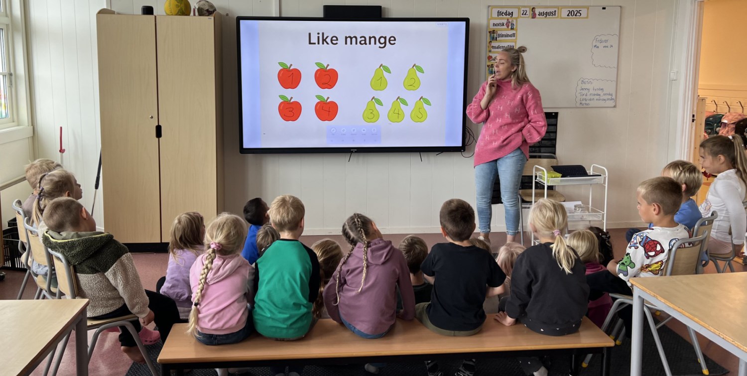 Me har lært oss omgrepa «høgast, lågast, færre og flest» i matematikk og har byrja å snuse på pluss og addisjon. Stasjonsundervisning er favoritten til både born og vaksne, og her klarer me også å bevara den gode leiken, som me veit er eit veldig viktig element i kvardagen til dei yngste elevane.