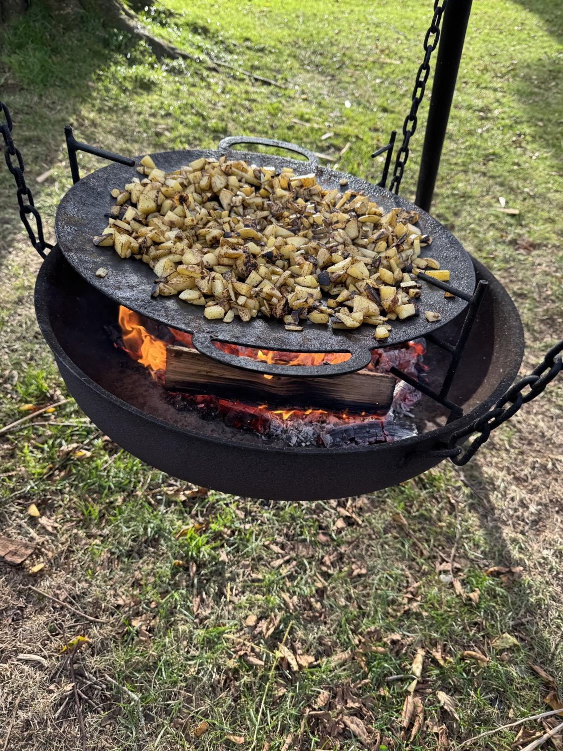 På den tredje stasjonen fekk elevane vaska, delt og steikt potetene som dei hadde teke opp. Det var stas å laga mat av noko ein sjølv hadde vore med å hausta, og lukta av nysteikte poteter spreidde seg raskt i heile området.