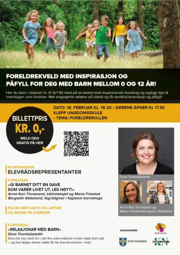 Klepp kommune, Klepp Næringsforeining og Jærhagen inviterer kvar vår og haust til ein kveld med inspirasjon, påfyll og nyttig informasjon for foreldre.