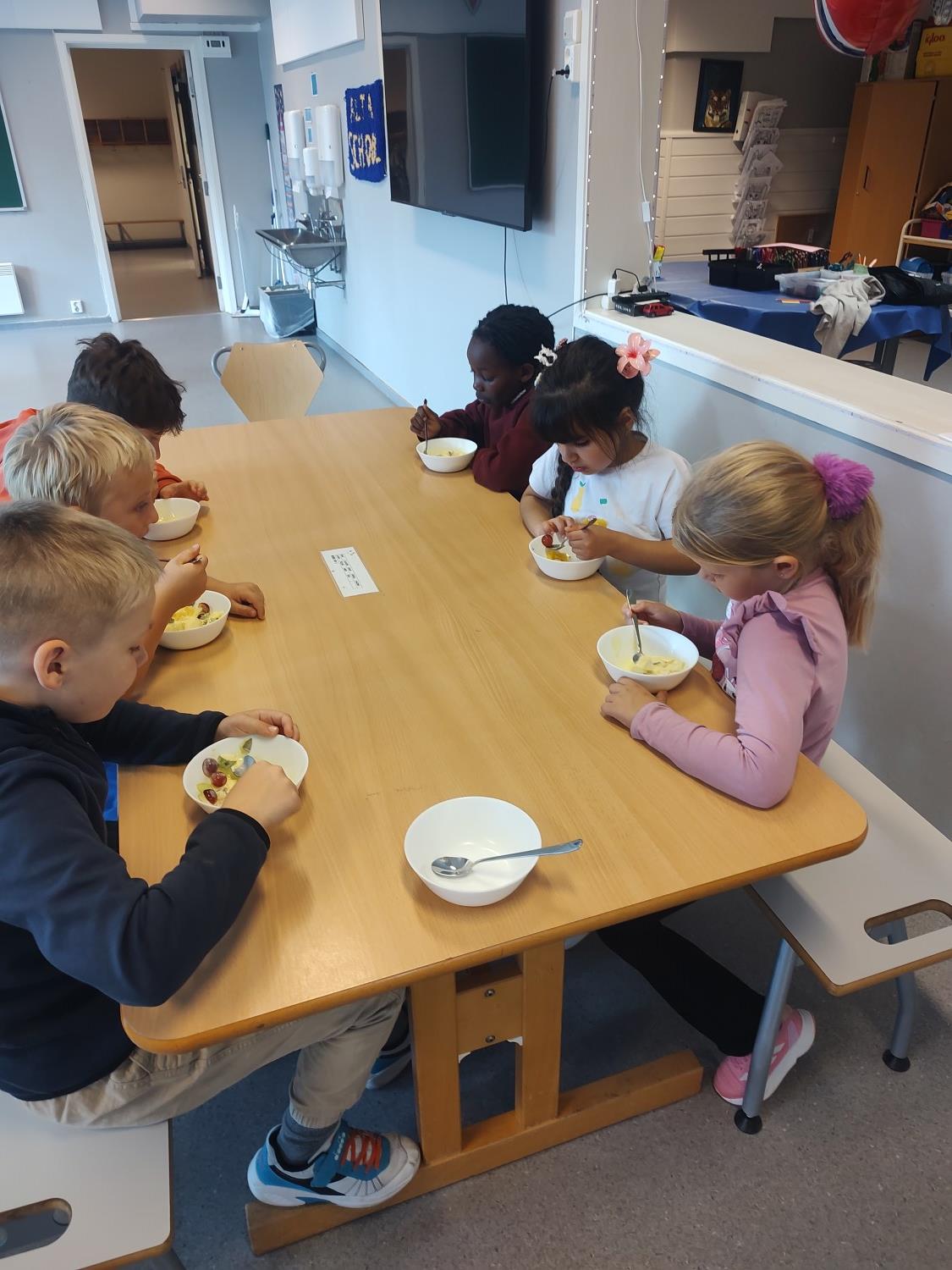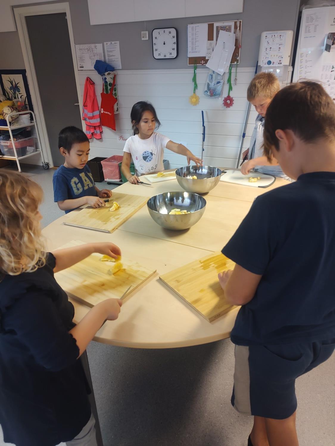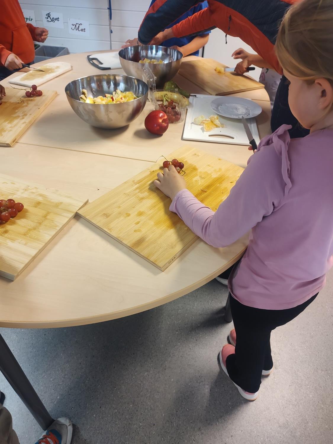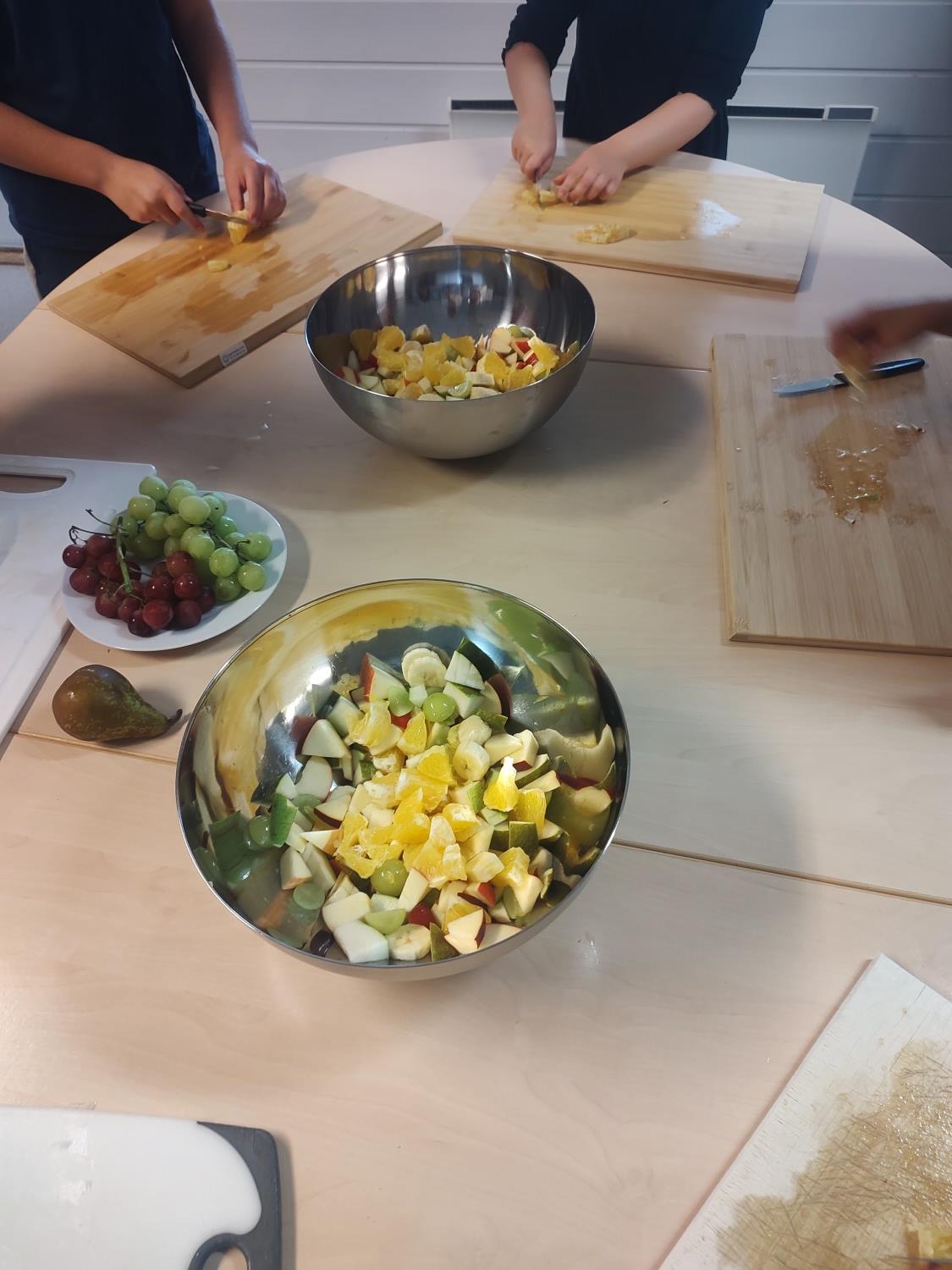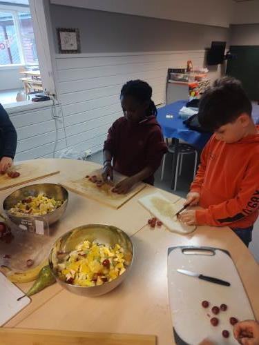 1. og 4. klasse har kost seg med å lage fruktsalat sammen, Mens noen jobbet på kjøkkenet, spilte resten brettspill sammen i klasserommet. Alle var med og hjalp med å kutte frukt, elevene var kjempeflinke:)