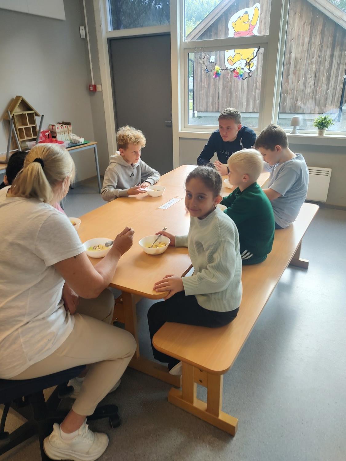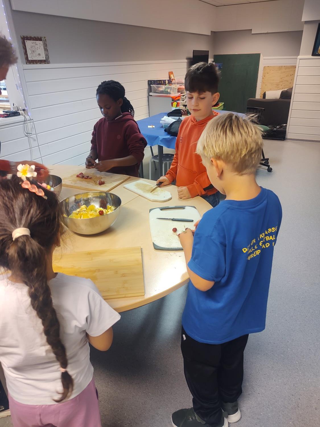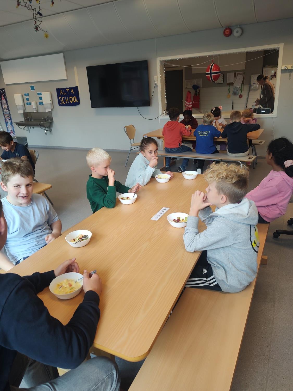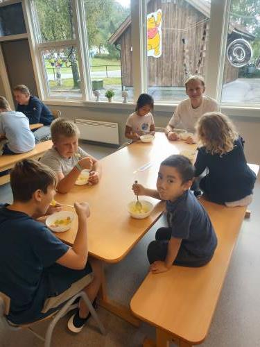 1. og 4. klasse har kost seg med å lage fruktsalat sammen, Mens noen jobbet på kjøkkenet, spilte resten brettspill sammen i klasserommet. Alle var med og hjalp med å kutte frukt, elevene var kjempeflinke:)