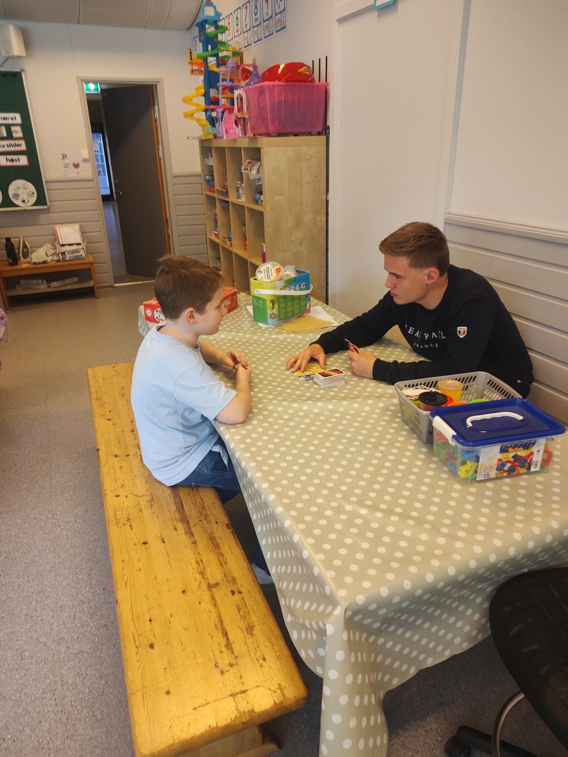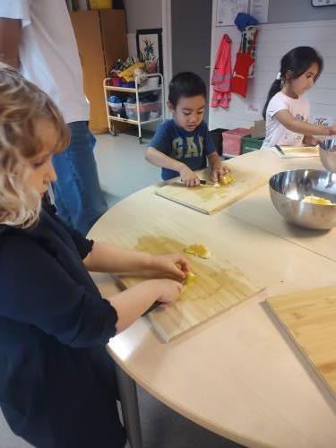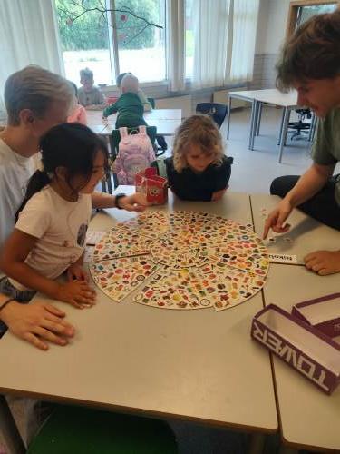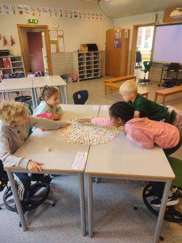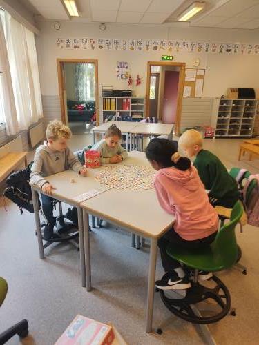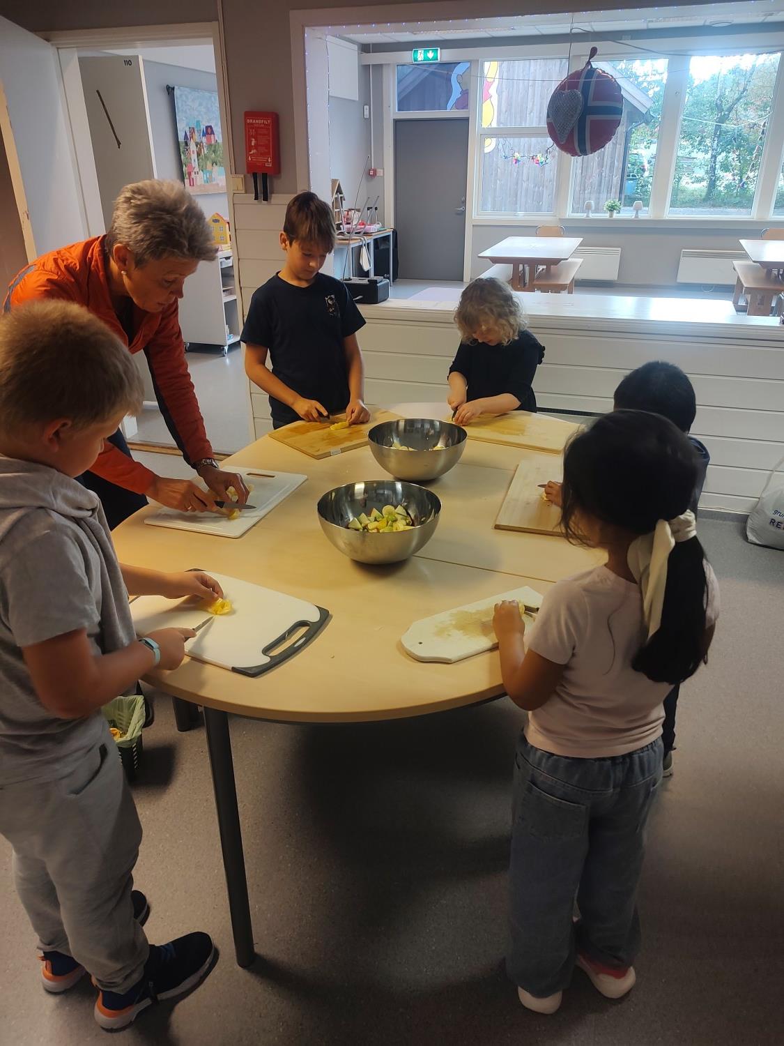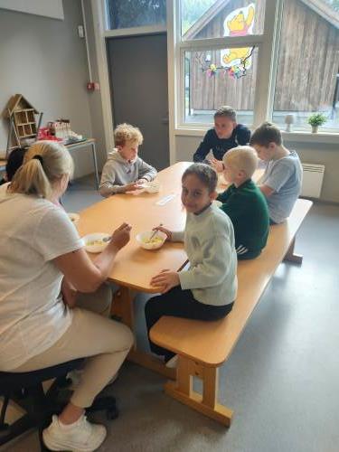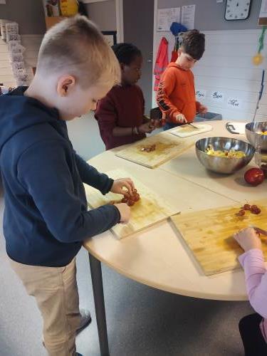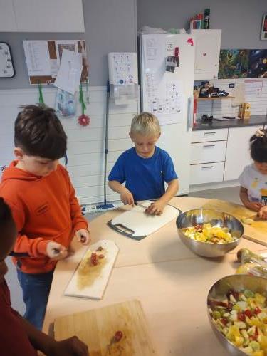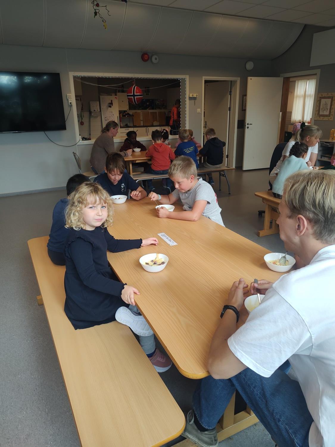 1. og 4. klasse har kost seg med å lage fruktsalat sammen, Mens noen jobbet på kjøkkenet, spilte resten brettspill sammen i klasserommet. Alle var med og hjalp med å kutte frukt, elevene var kjempeflinke:)