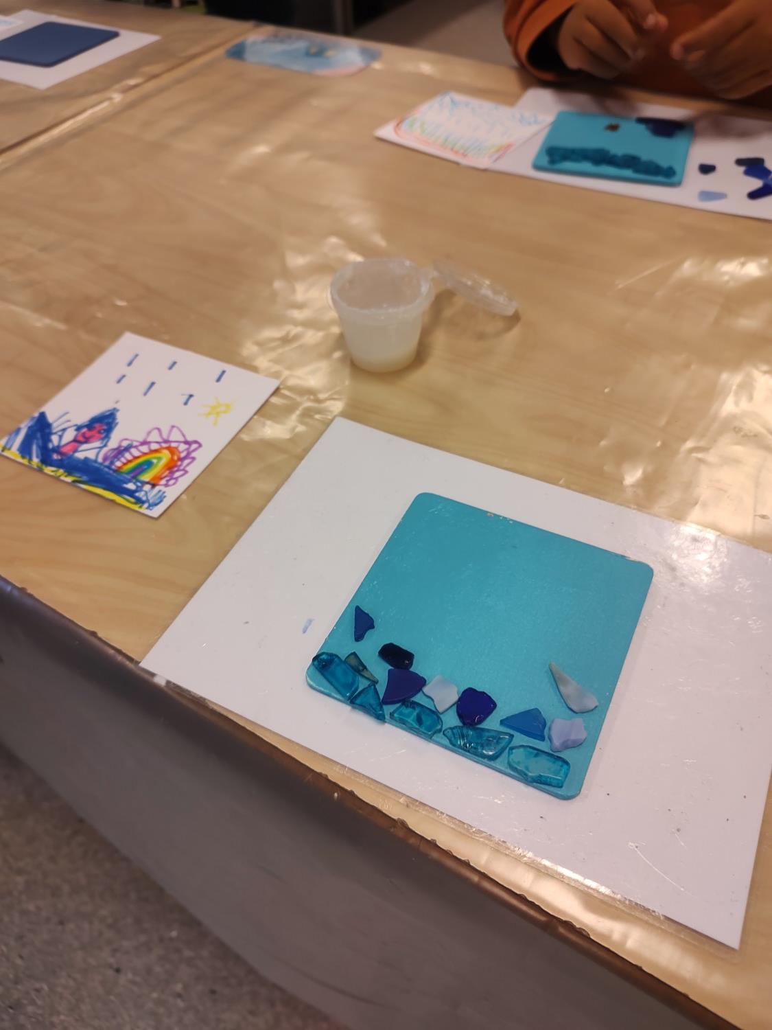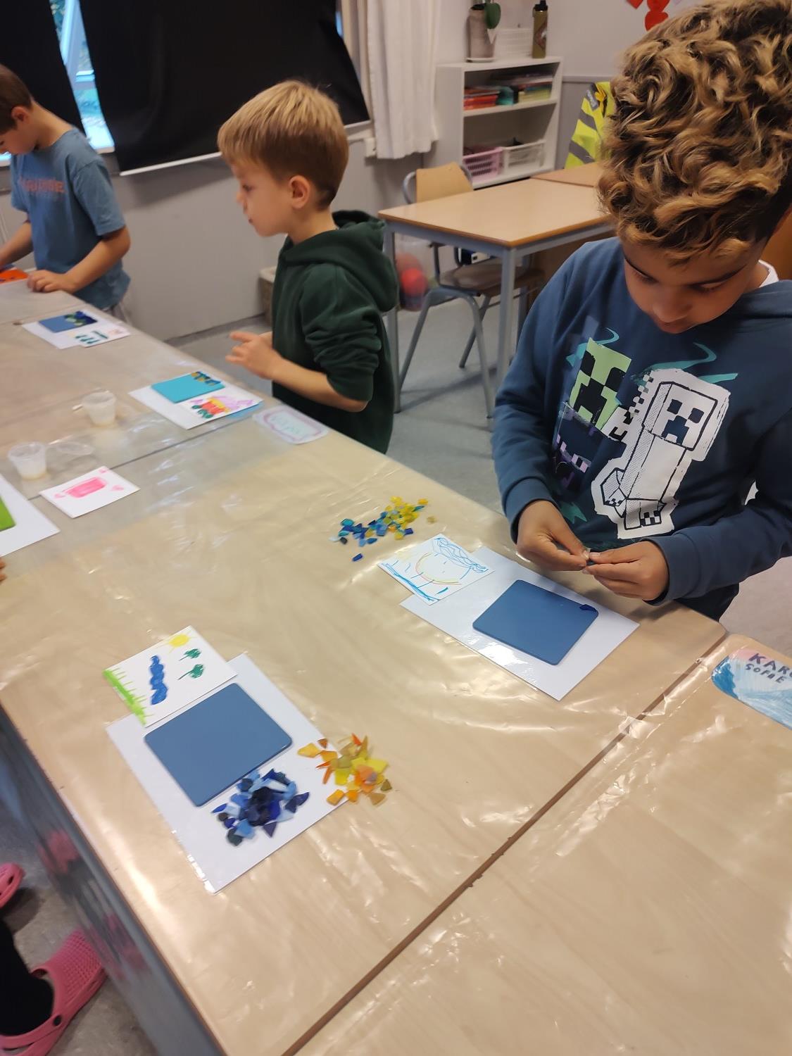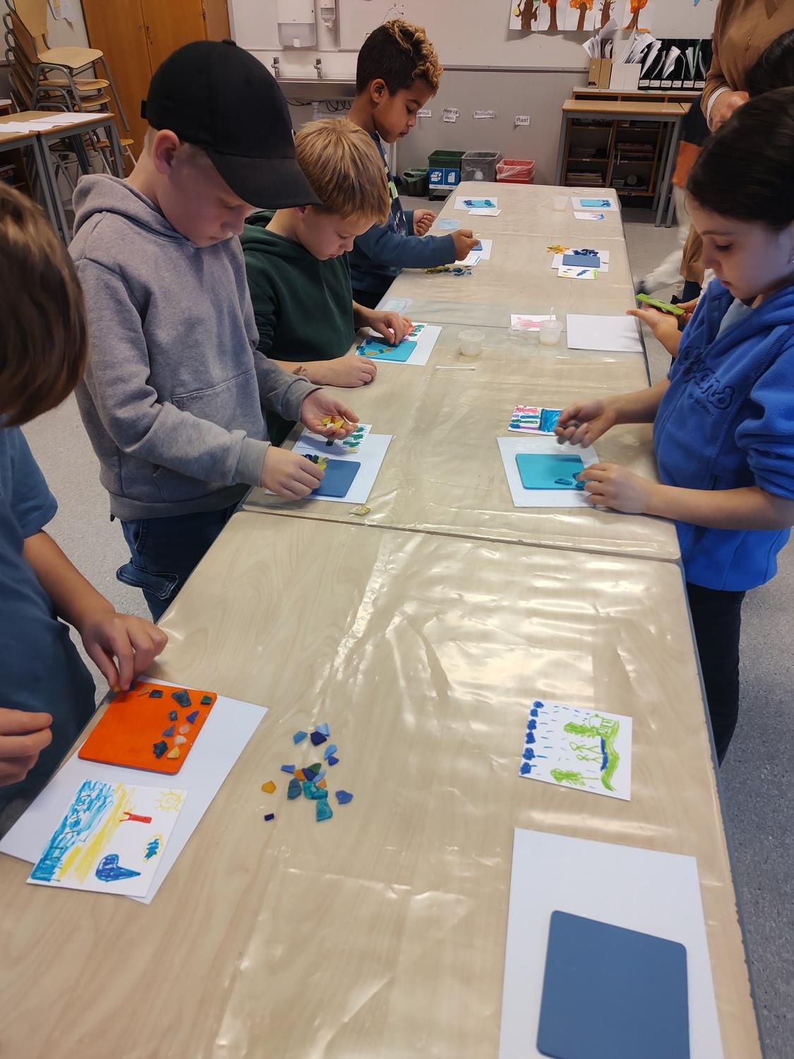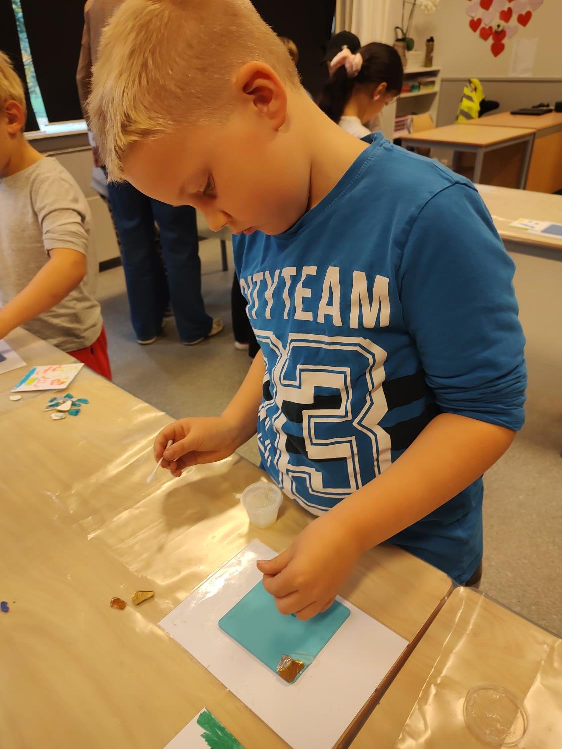 På fredag var vi så heldige å få besøk av kunstneren Anna Berthelsen. Alle fikk lage hvert sitt kunstverk av farget glass. Se på de fine resultatene:)