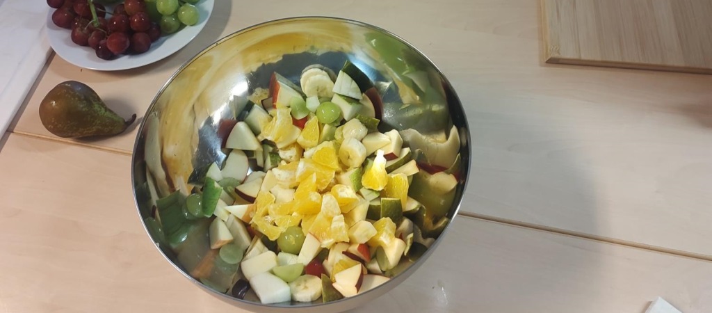 1. klasse lager fruktsalat sammen med fadderne sine:)