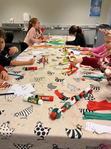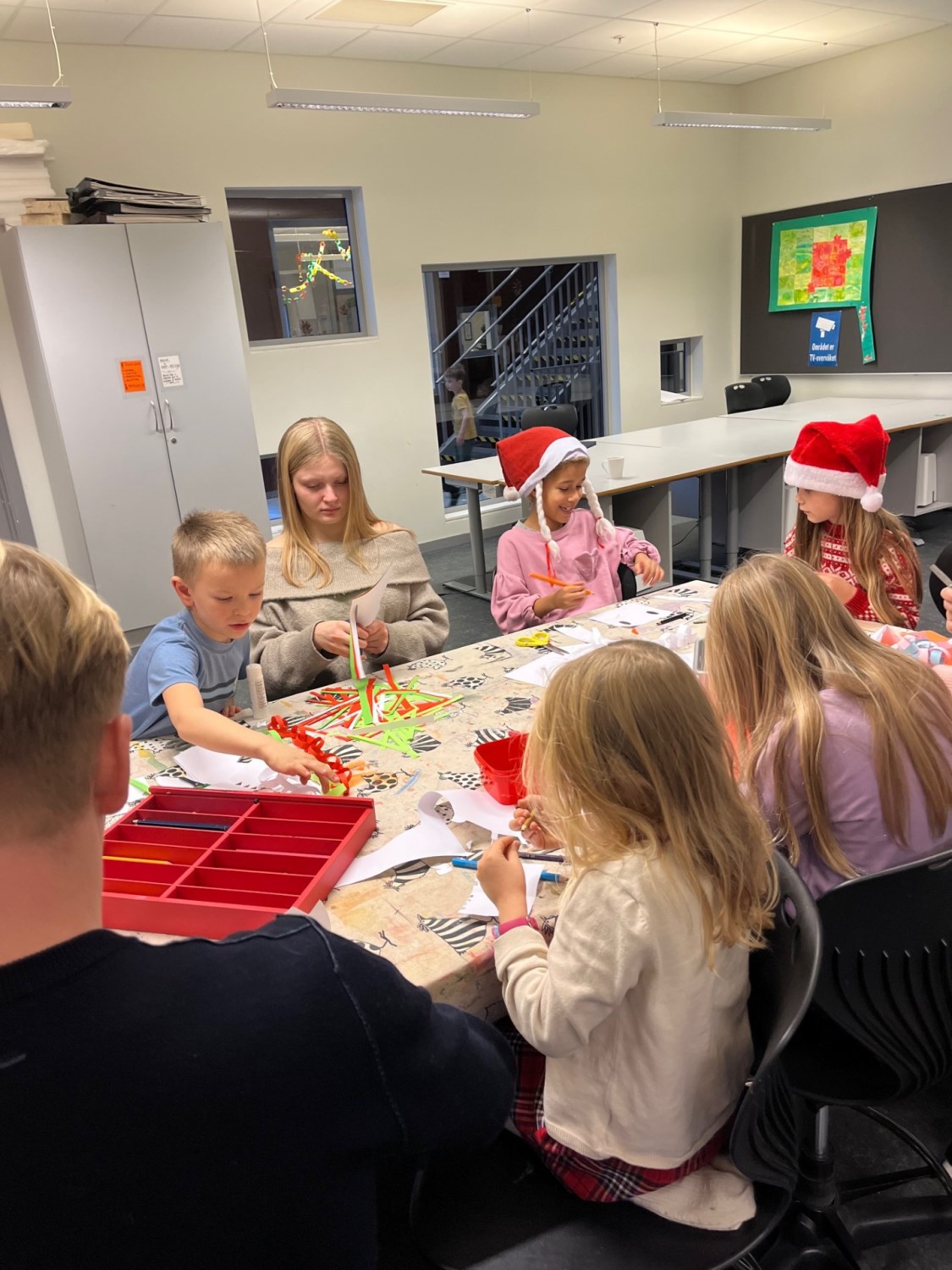 Juleførebuingane er godt i gang på SFO! Barna lagar pynt, syng songar og neste veke vert det pepperkakebaking.