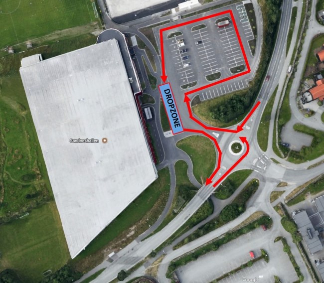 - For å unngå trafikkfarlige situasjoner vil vi at foreldre som ser seg nødt til å kjøre barna om morgenen slipper de av nede ved Sandneshallen. Rute og "dropzone" er merket på vedlagt bilde. Se nøye på det!