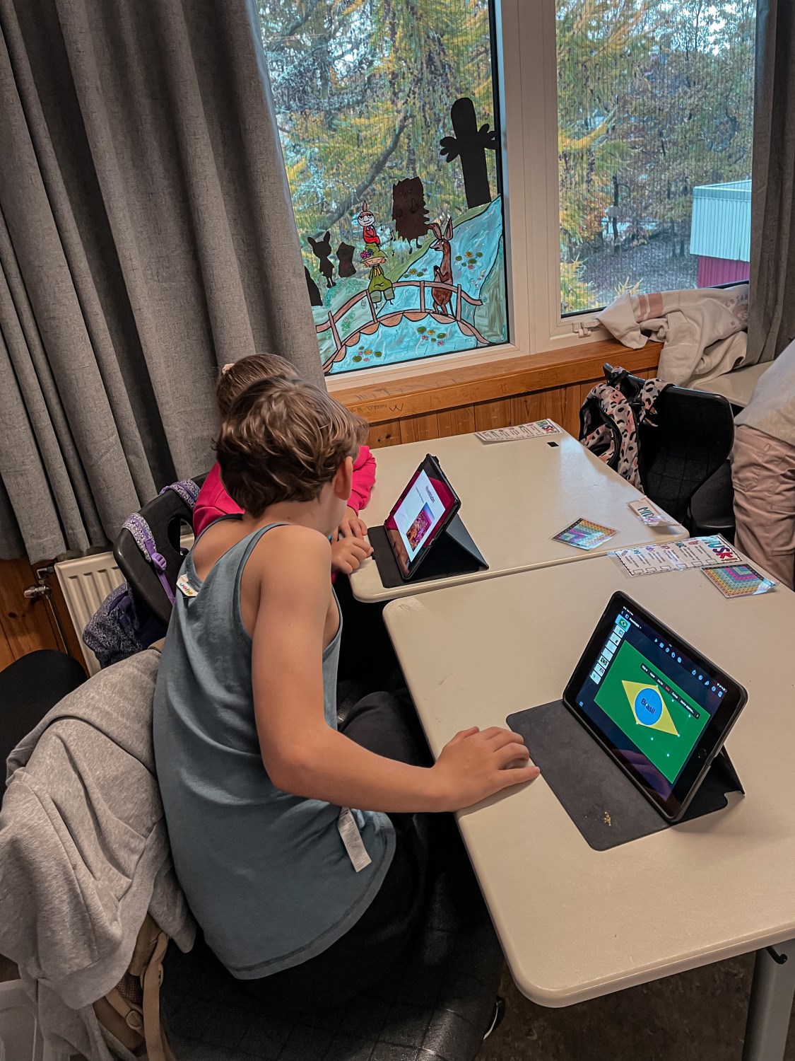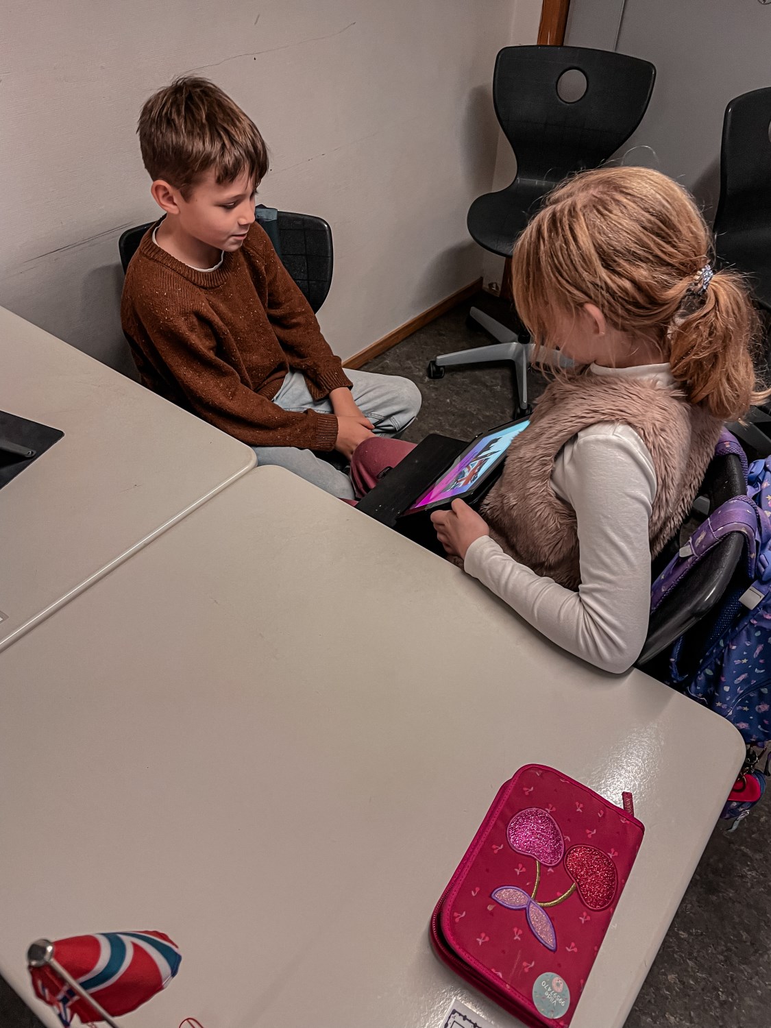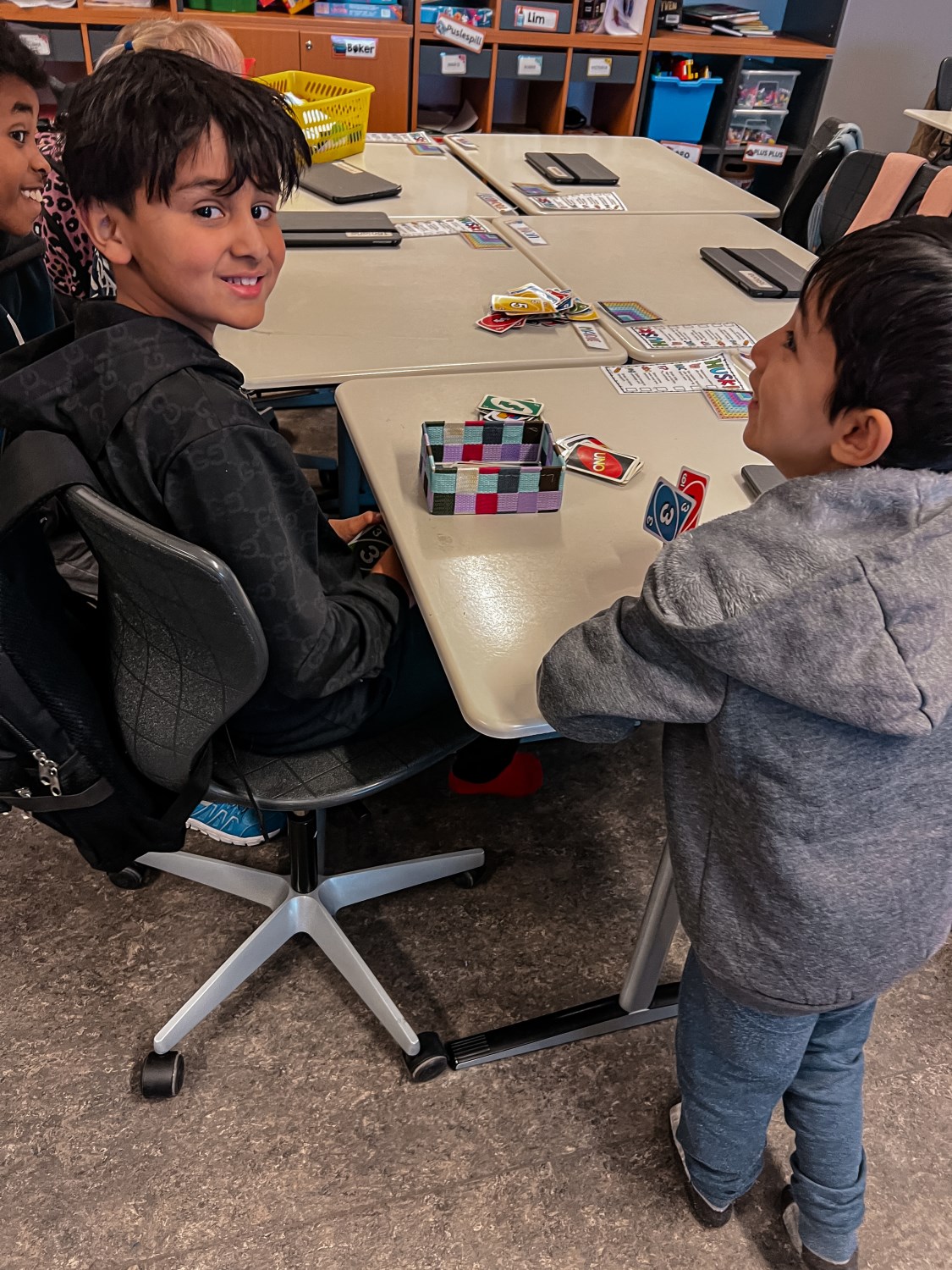 4.klassingene brukte starten av timen til å vise fram og fortelle fadderbarna på 1.trinn om landene sine. De satt sammen i par eller små grupper, viste og fortalte. 4.klassingene syntes det var stor stas å få vise fram, og 1.klassingene syntes det var gøy å se hva de store hadde å fortelle.