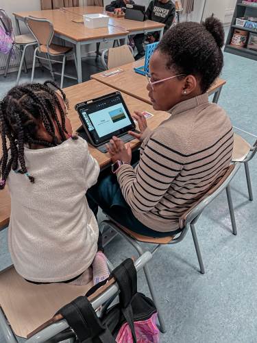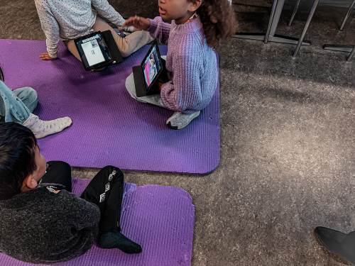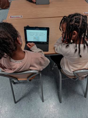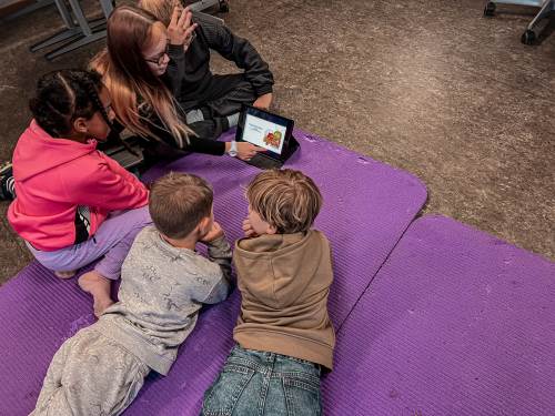 Tirsdag startet dagen med en faddertime. 4B inviterte fadderbarna på presentasjon og lek.