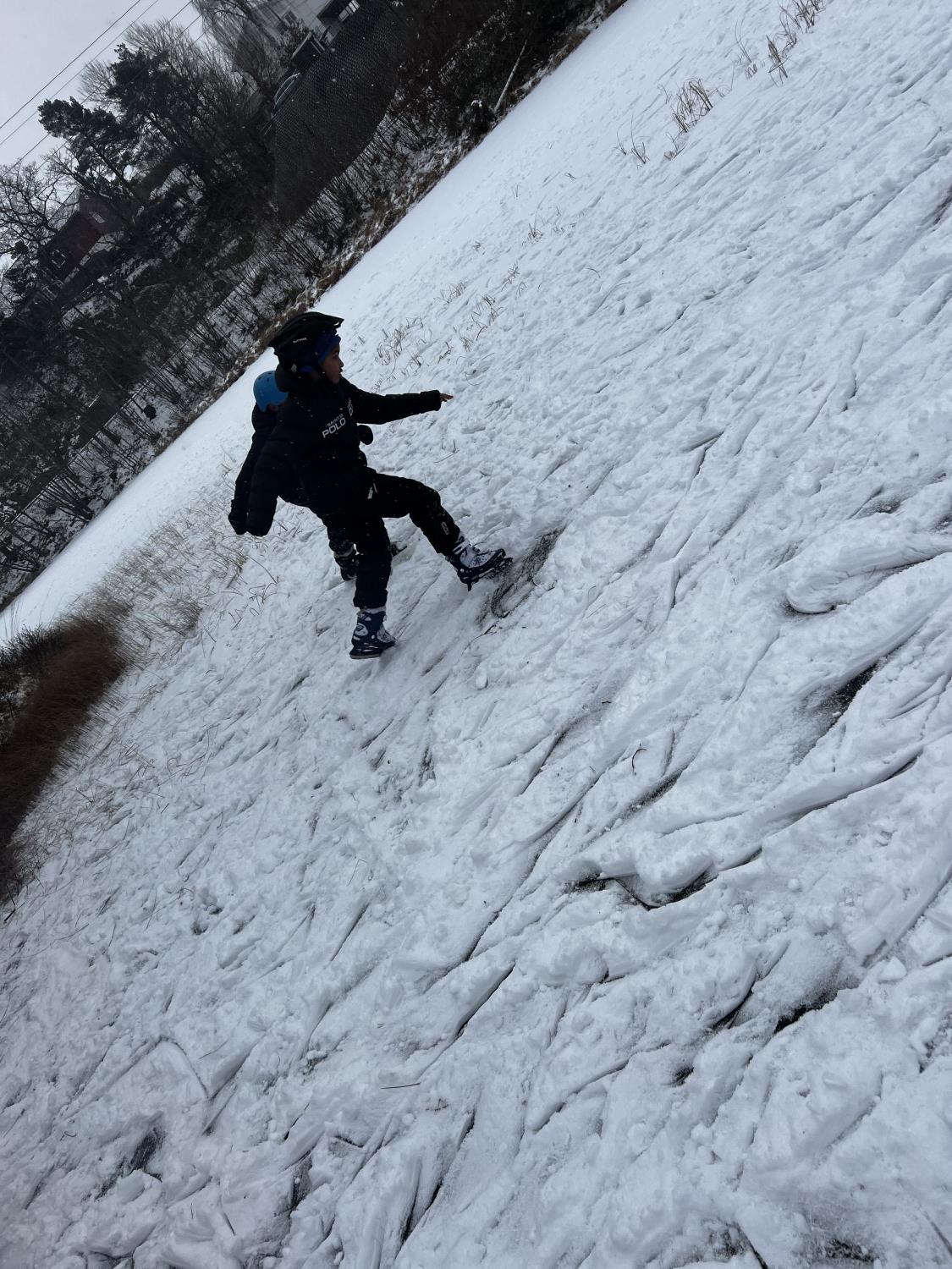 Vi gikk til Blåbærtjønn tidlig på dagen. Det var en lang og tung gåtur. Alle hadde sekk med mat og ved, hjelm og skøyter.