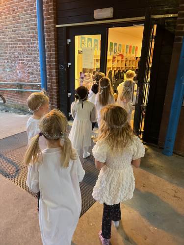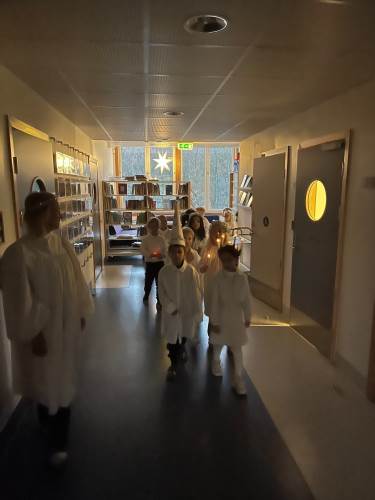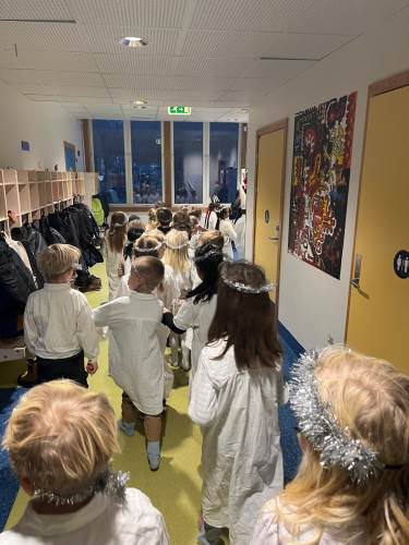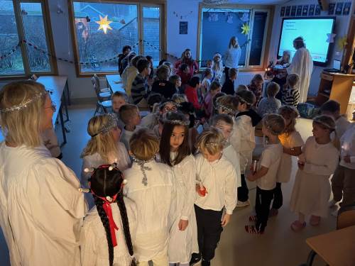 Luciadagen er en fin tradisjon som minner oss om lys i mørketiden, og i dag fikk hele skolen oppleve den. Førsteklasse gikk Luciatog gjennom gangene og inn i alle klasserommene. Barna sang Luciasangen og skapte en varm og hyggelig stemning. Med seg hadde de lys og lussekatter, og alle fikk smake på lussekattene som 6. klasse hadde bakt. Det ble en morgen fylt med sang, lys og fellesskap – en tradisjon som sprer glede til både store og små.