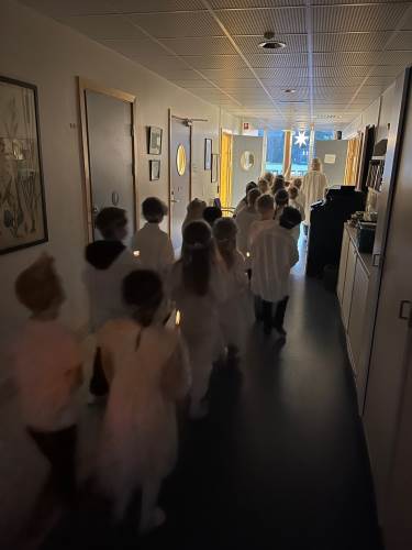 I dag gikk førsteklasse Luciatog og besøkte alle klassene. De sang vakkert og delte ut lussekatter som 6. klasse hadde bakt.