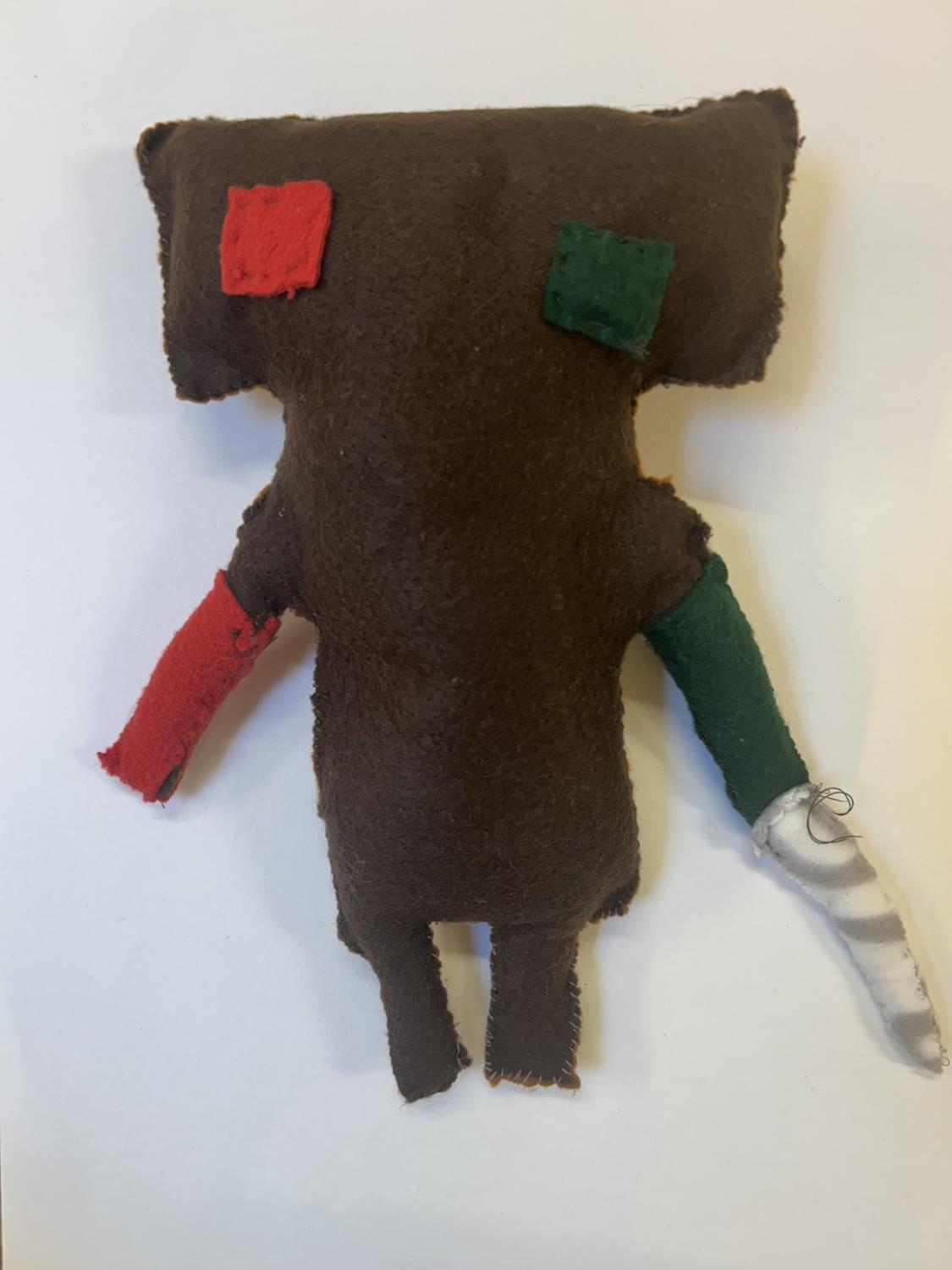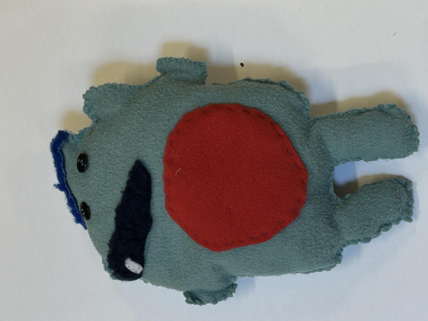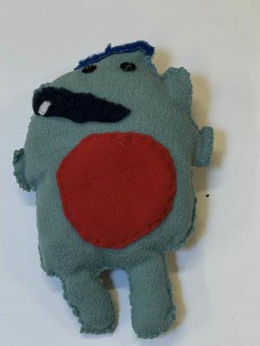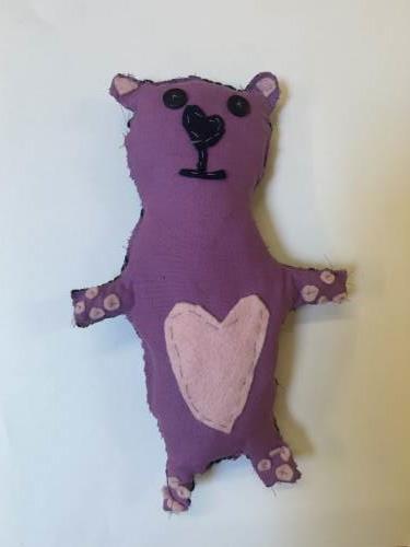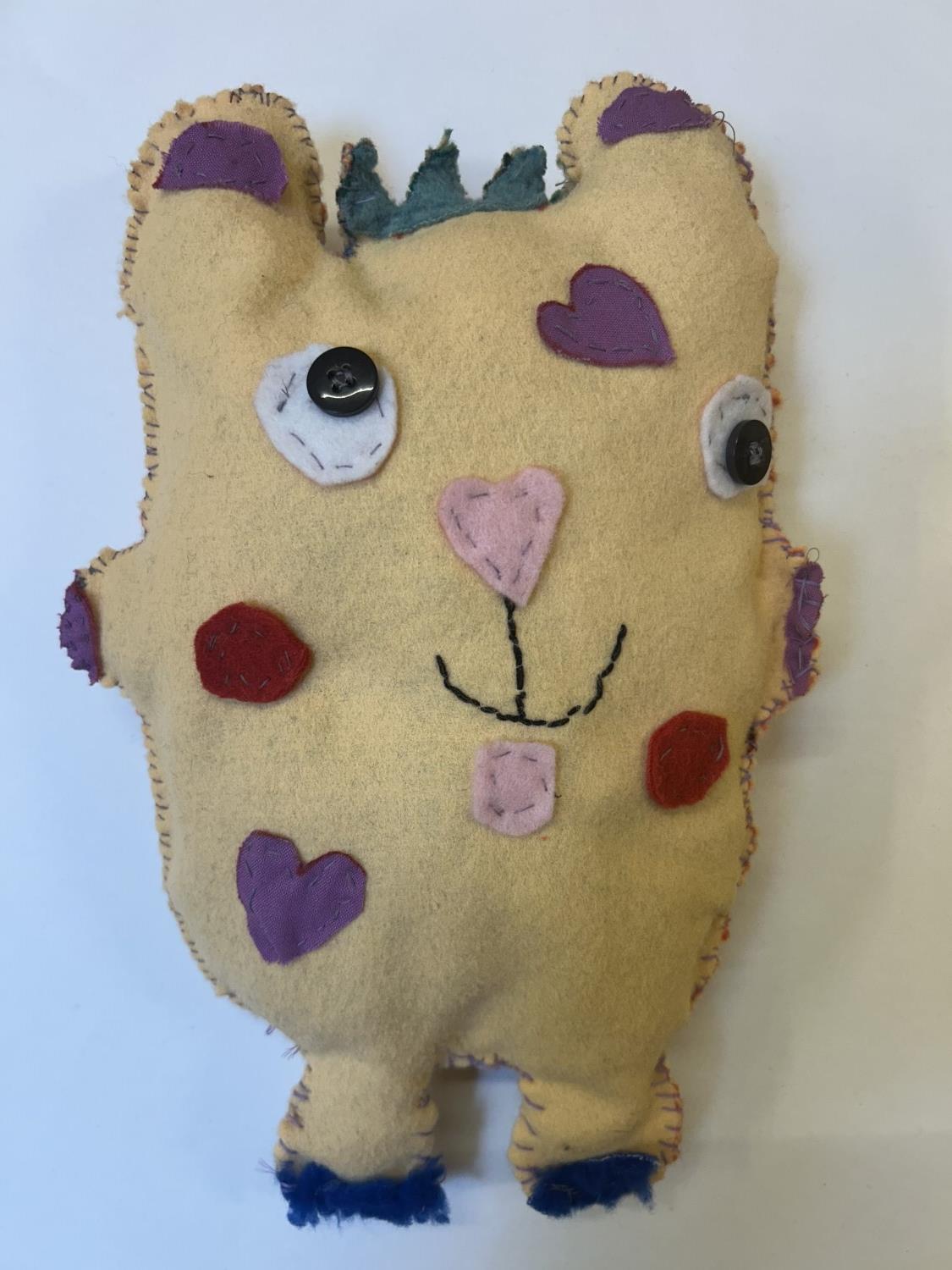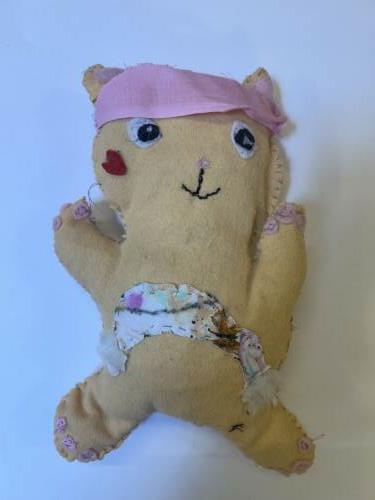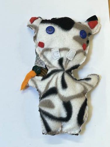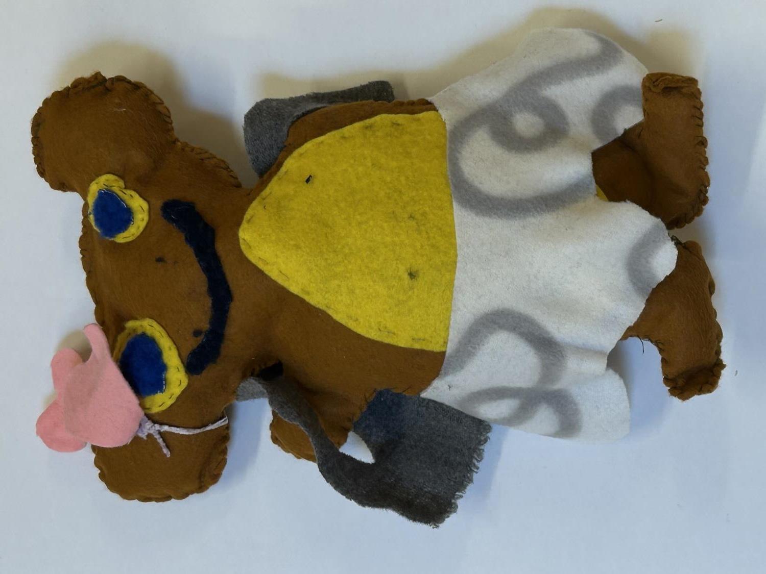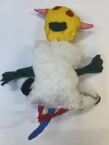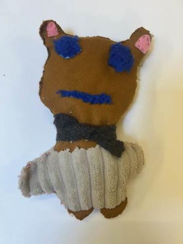 Vi fikk tegninger av fadderbarna. Så lagde vi en mal til tegningen som vi klippet ut. Vi brukte stoff av gamle tepper og litt annet. Vi måtte være veldig forsiktige med å klippe stoff, så de to sidene ble like og at vi ikke brukte for mye. Så sydde vi. Først sydde vi på tilbehøret og deretter de to sidene sammen. Vi måtte passe på at vi hadde en åpning til å legge in stoff. Når alt var sydd sammen var vi ferdige.
