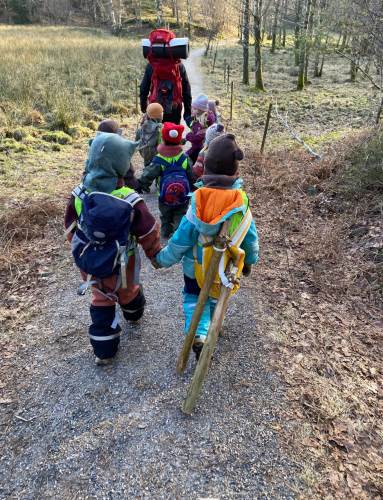 Vi ønsker å gi barna turglede og respekt for naturen. Gjennom lek og aktivitet lærer de om naturens mangfold, bærekraftige valg og hvordan vi kan bruke naturen på en ansvarlig måte. Friluftsliv fremmer både fysisk og psykisk helse, og vi samarbeider med Universitetet i Agder (UiA) for å videreutvikle dette arbeidet.