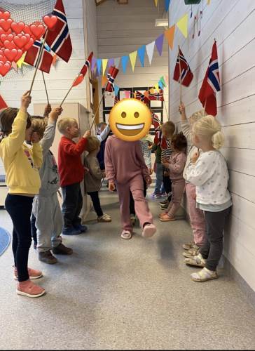 Fredag 6 juni hadde vi en hjertevarm avskjedsfest for våre skolestartere, som snart tar steget videre til skolen. Festen startet med at skolestarterne marsjerte inn til tonene av en fin musikk 🎶, mens vi voksne og de andre barna vaiet med flaggene for å feire dem. Stemningen var både høytidelig og gledelig 😊