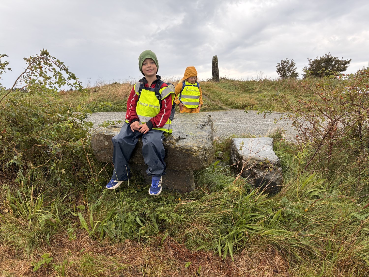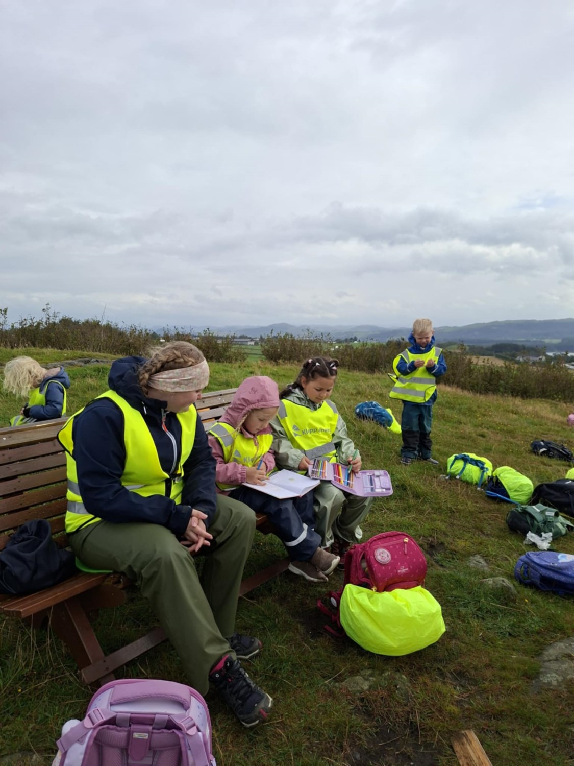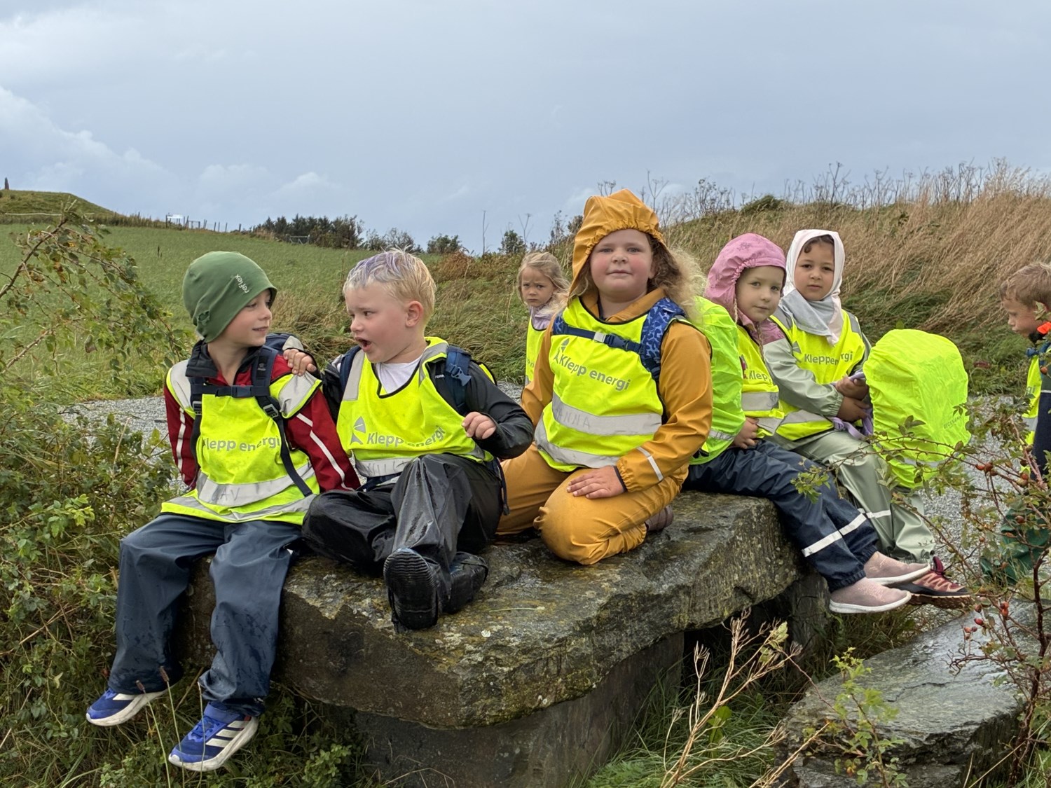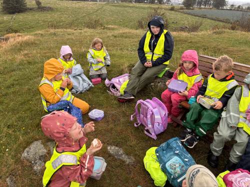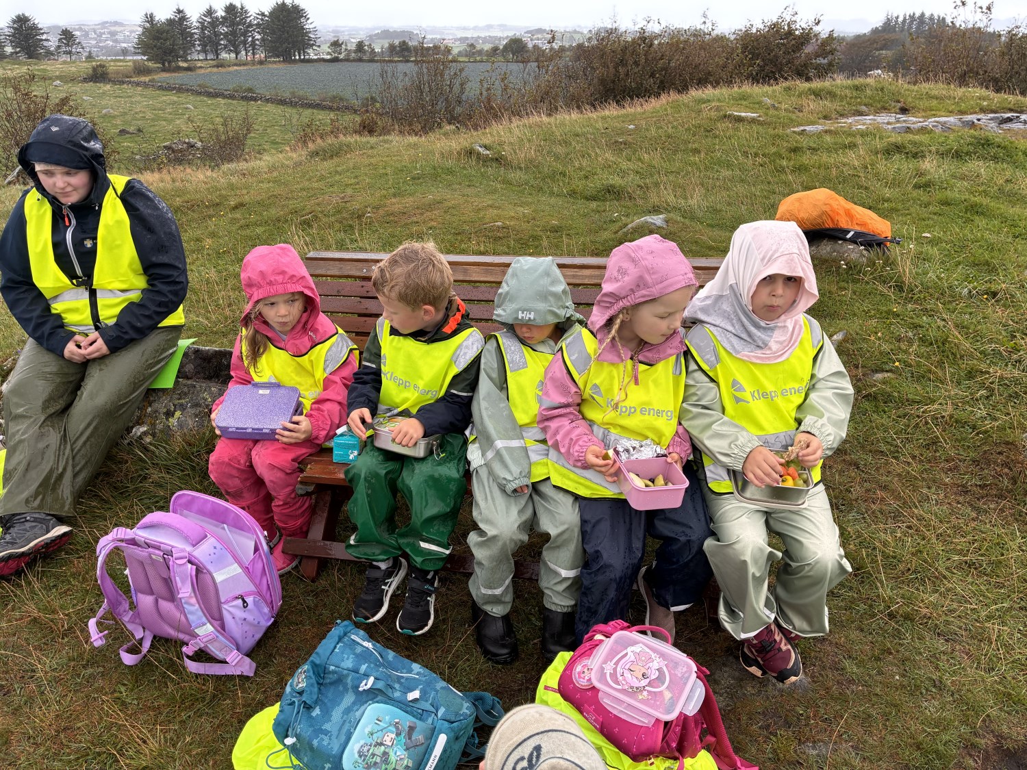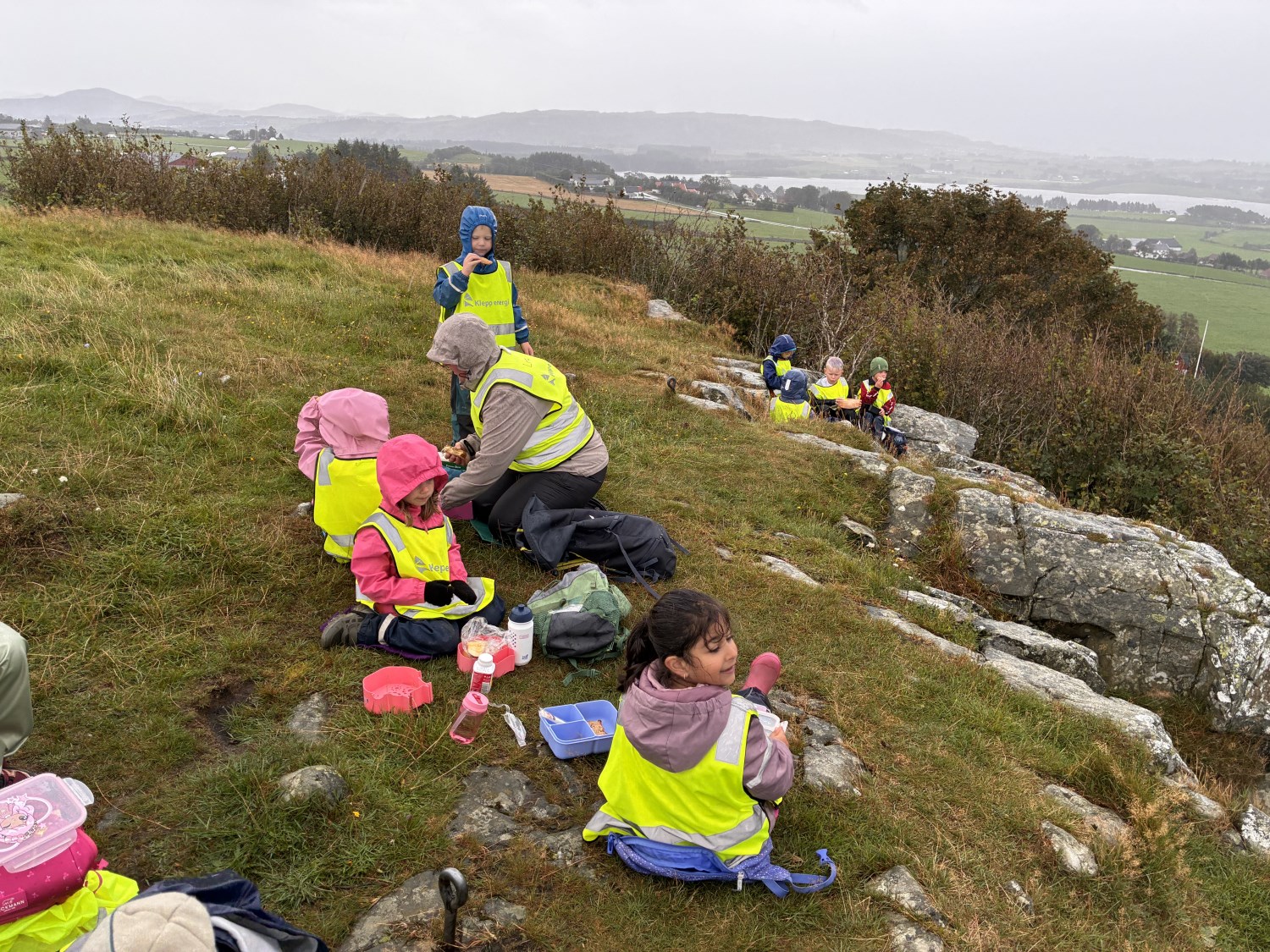 Onsdag gjekk 1. trinn på tur til Tinghaug. Sjølv om det var opphaldsvêr på vegen opp, byrja det å komme regn akkurat då me sette oss ned for å ete nista vår. Likevel gjorde det ingenting – det vart berre ekstra koseleg å sitje tett saman medan me høyrde regndropane tromme på jakker og matboksar.
