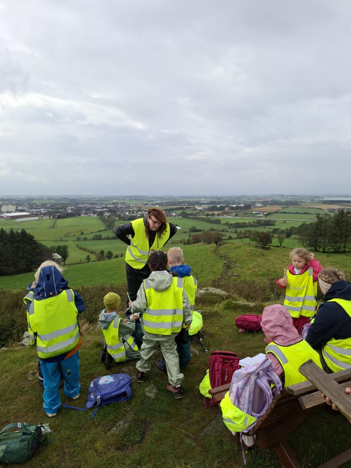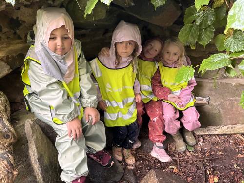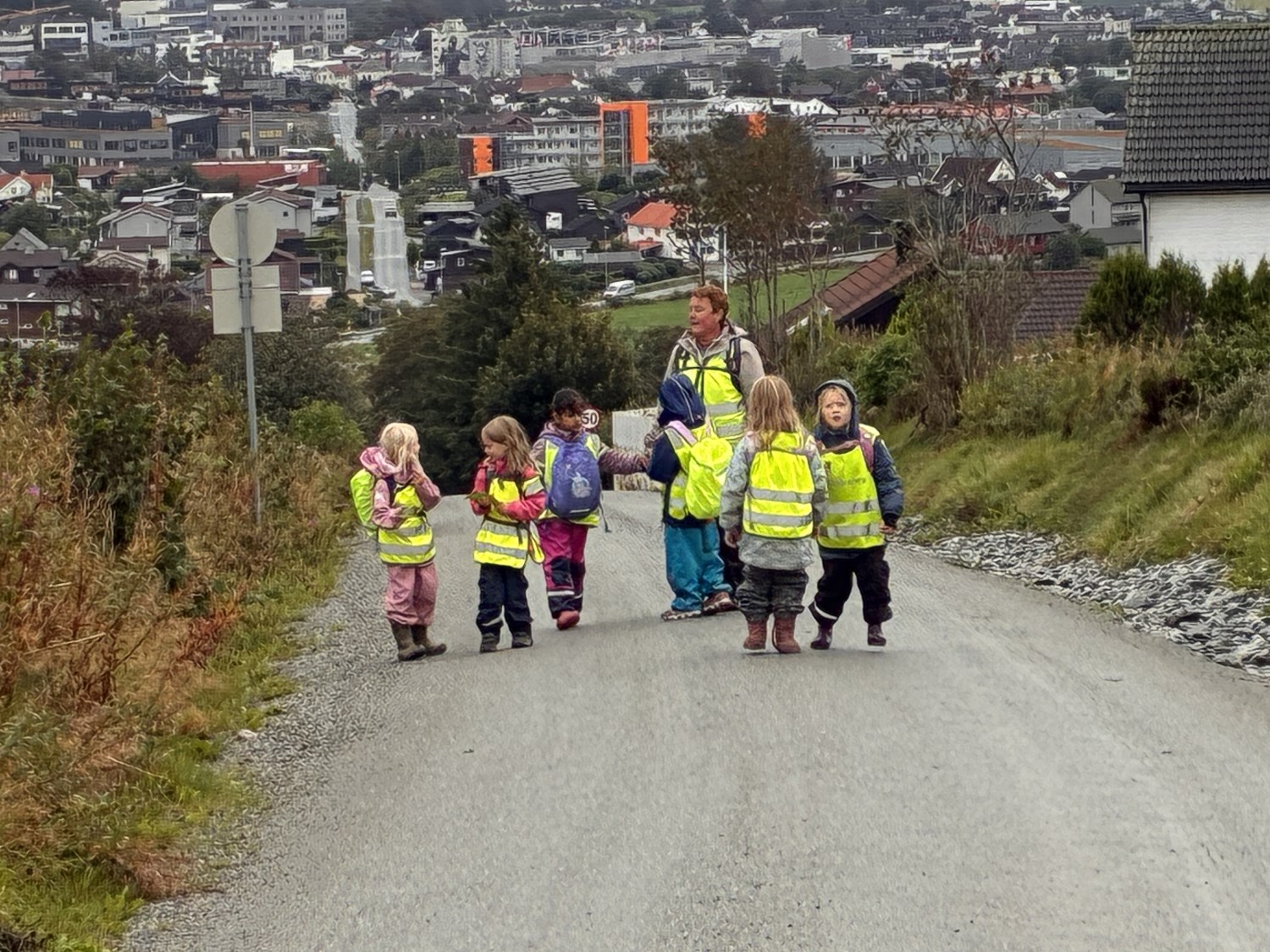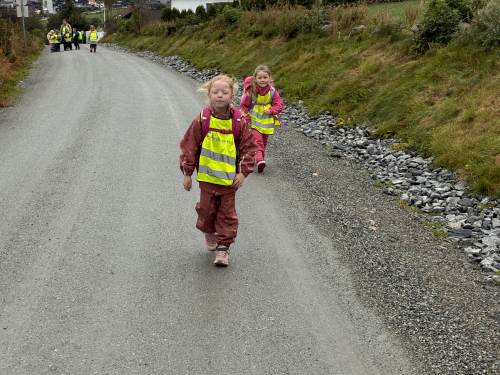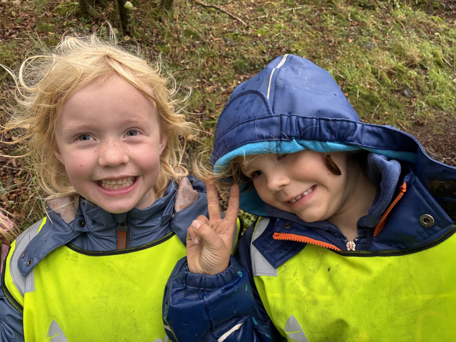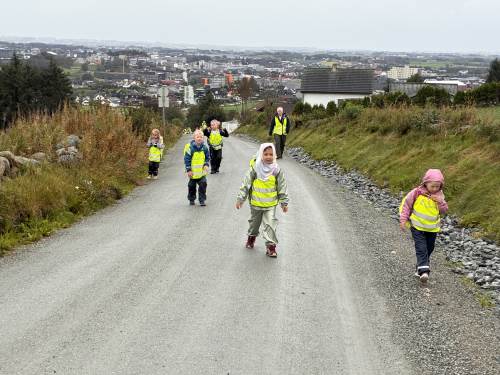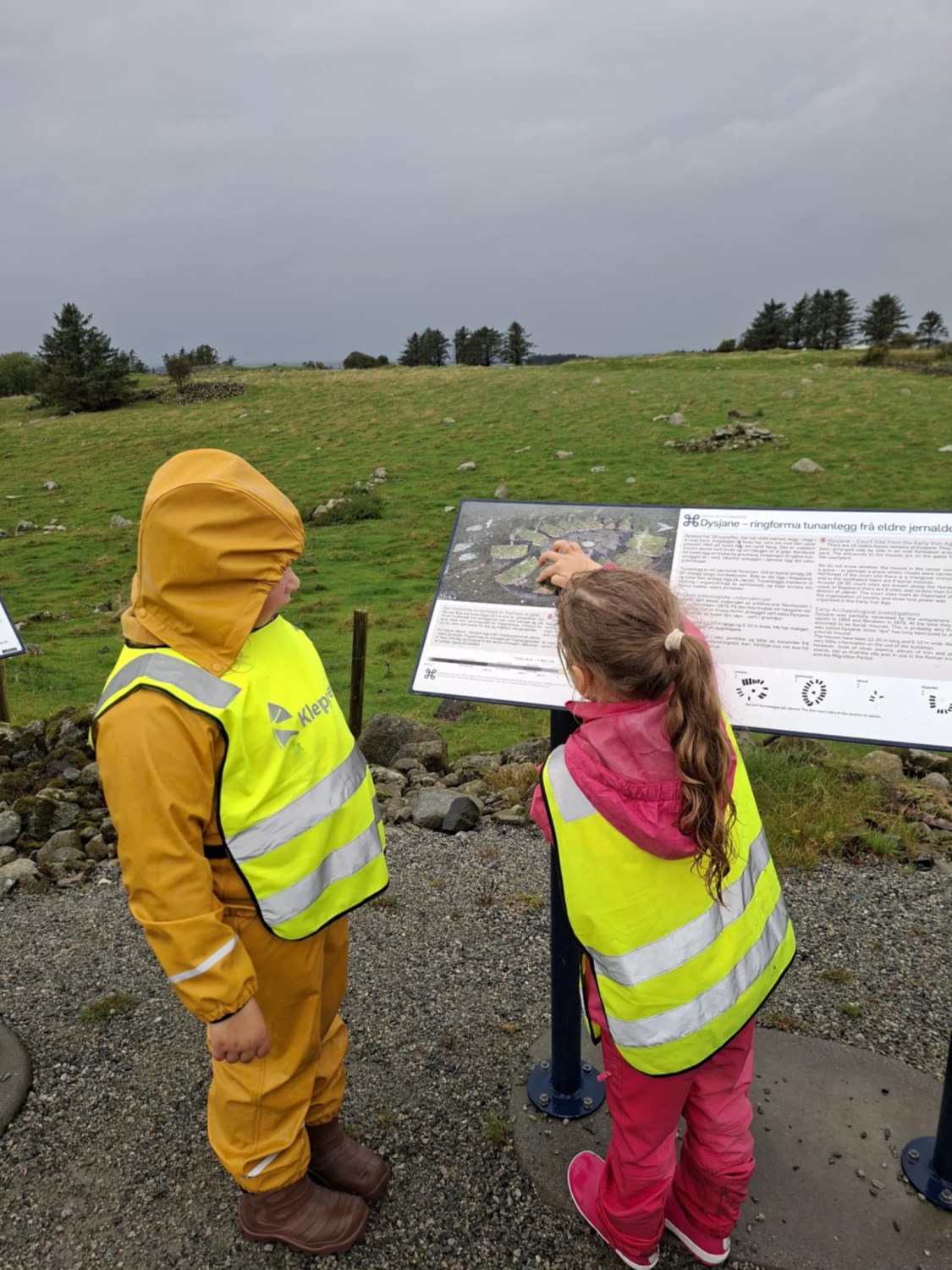 Onsdag gjekk 1. trinn på tur til Tinghaug. Sjølv om det var opphaldsvêr på vegen opp, byrja det å komme regn akkurat då me sette oss ned for å ete nista vår. Likevel gjorde det ingenting – det vart berre ekstra koseleg å sitje tett saman medan me høyrde regndropane tromme på jakker og matboksar.