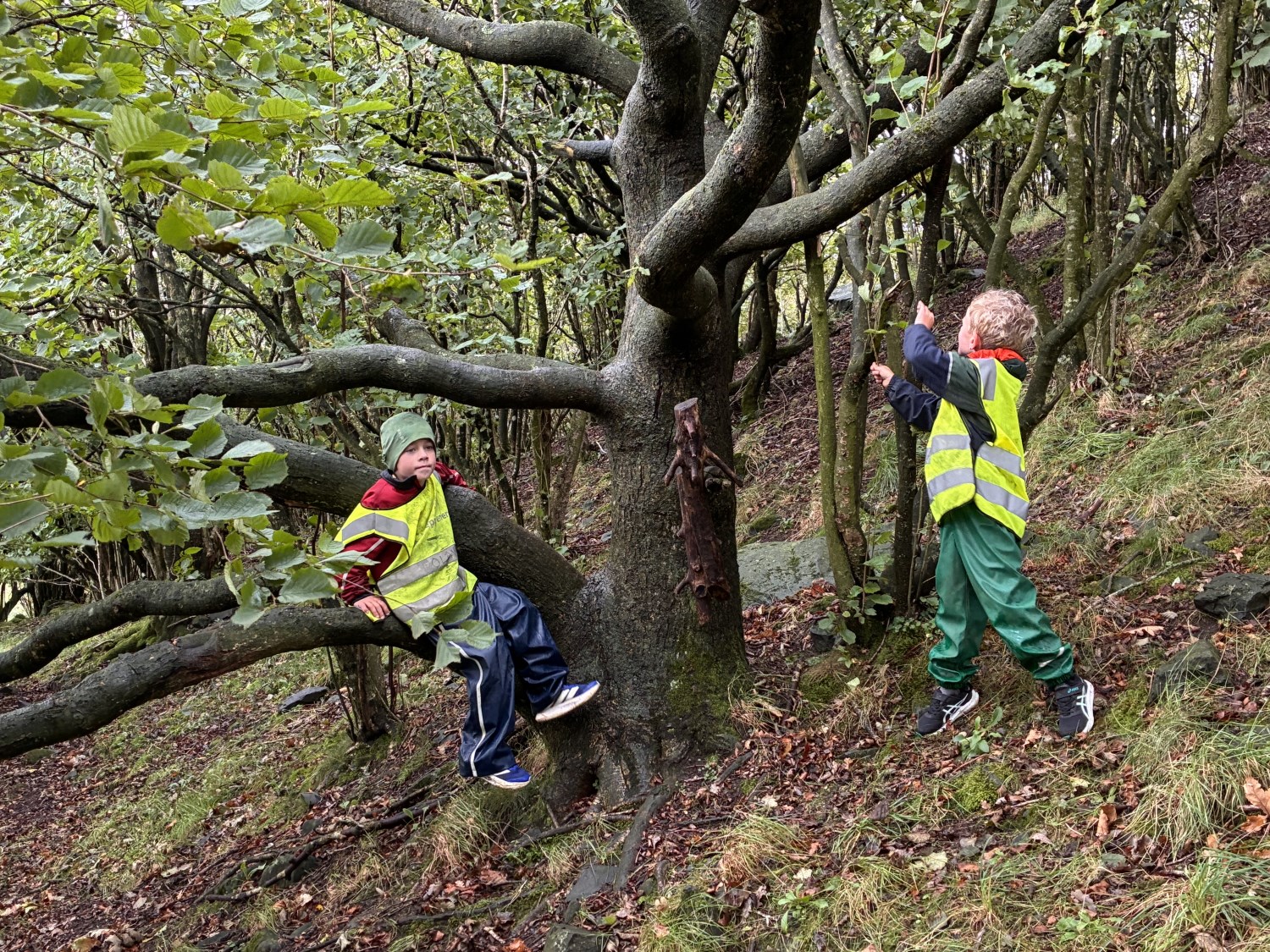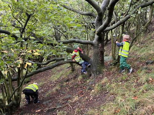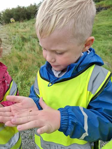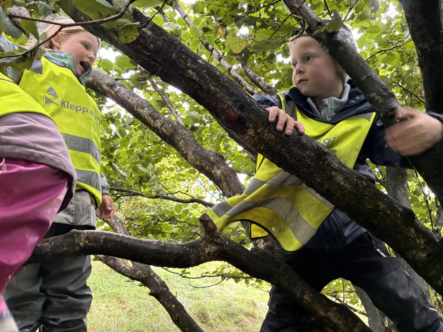 Etterpå fekk elevane tid til å leike. Nokre prøvde å klatre i tre, medan andre leita etter smådyr. Me fann både snigler som gleda seg over regnet, og ei lita marihøne som fekk sitje på fingeren før ho flaug av garde.