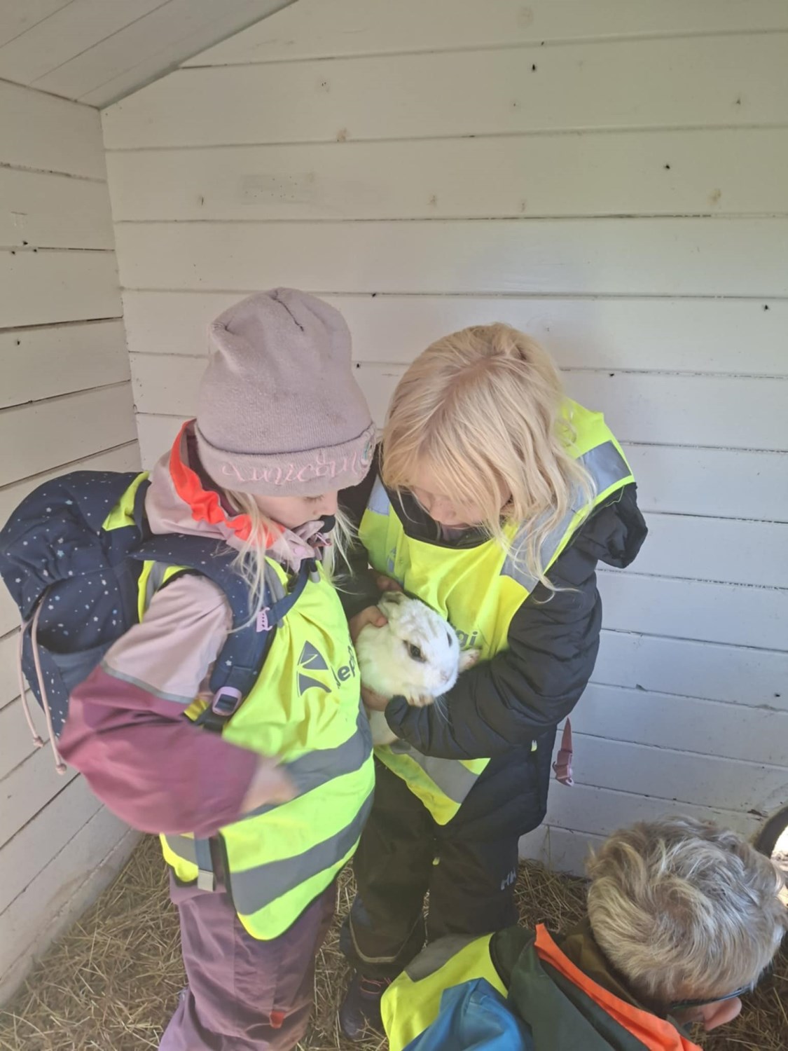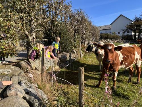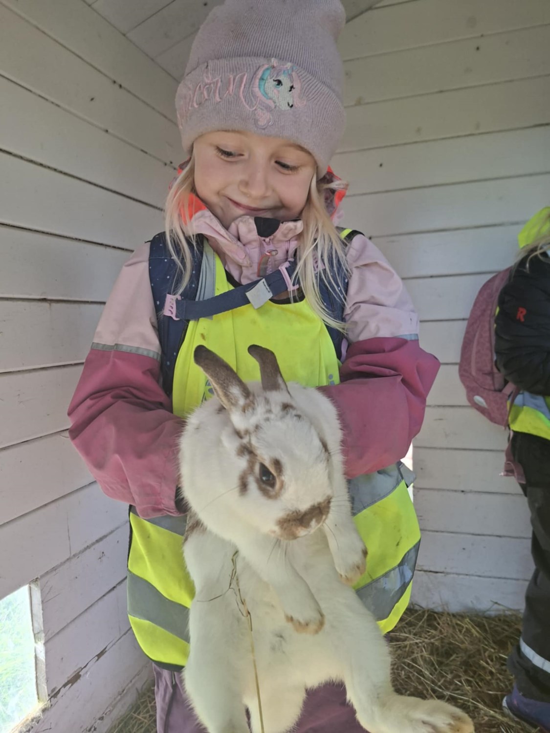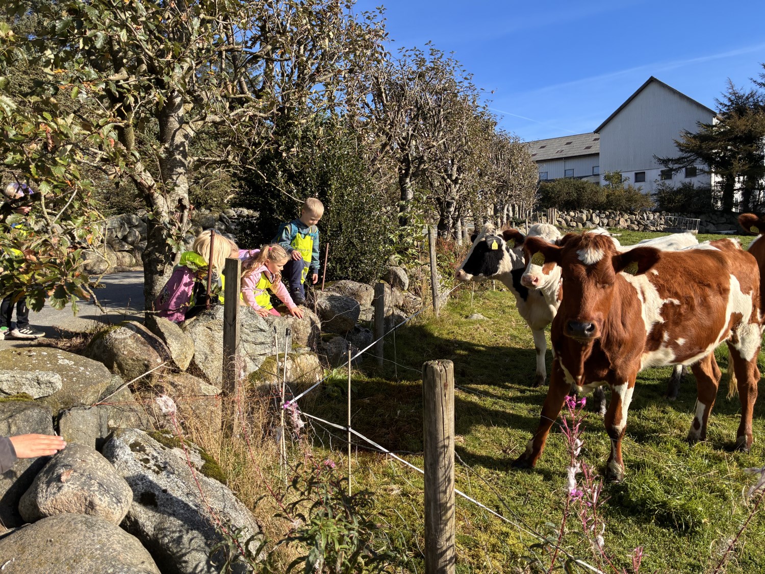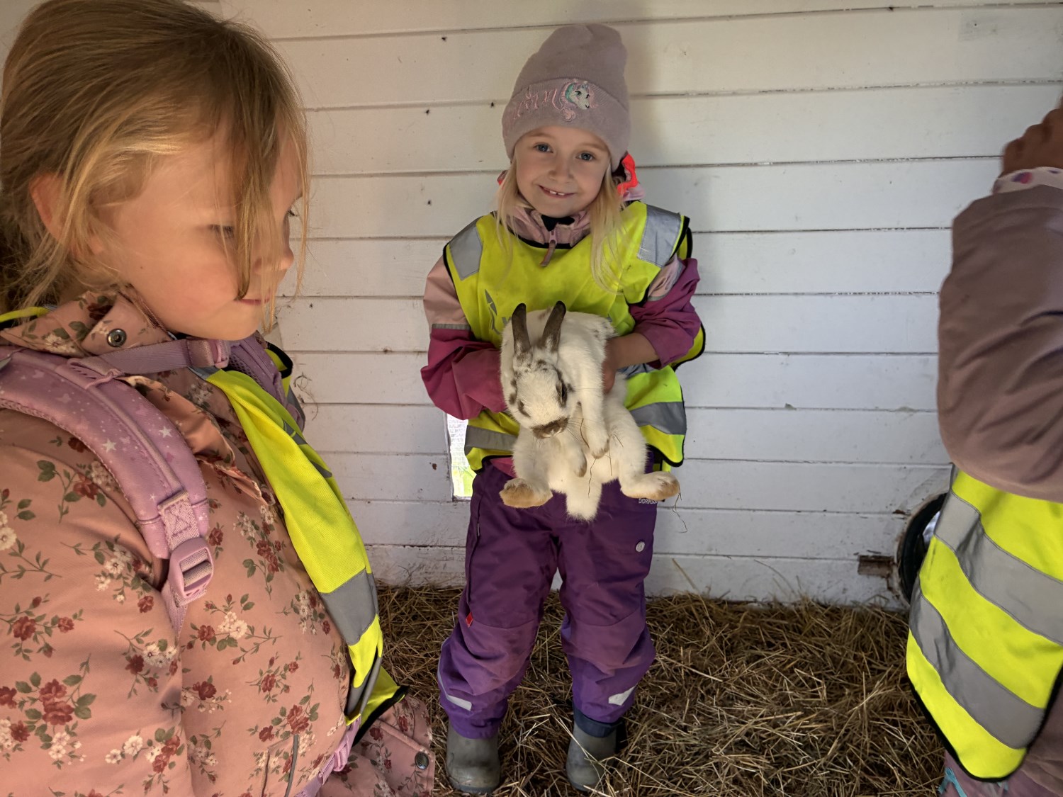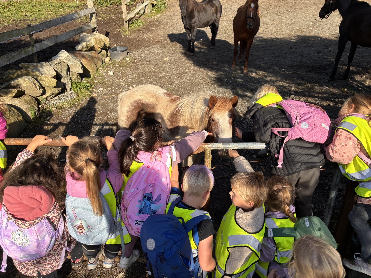 I dag gjekk me heim til Mathilde, der me fekk helsa på både hestar og kaninar. Me åt nista på Tinghaug. Etterpå ble det mykje god leik i bunkers og trea – nokre bygde til og med hytte! Til slutt gjekk me tilbake til skulen, der me var i slengdisser og teikna med kritt på bakken. Nå har me sett kor alle på 1.trinn bur. Alle synes det var stas å visa veg til sitt hus.